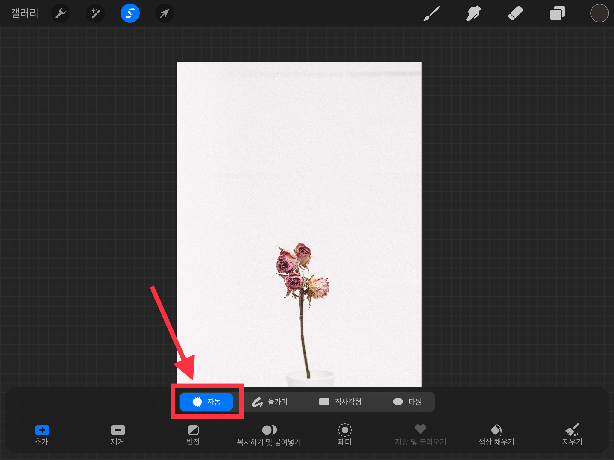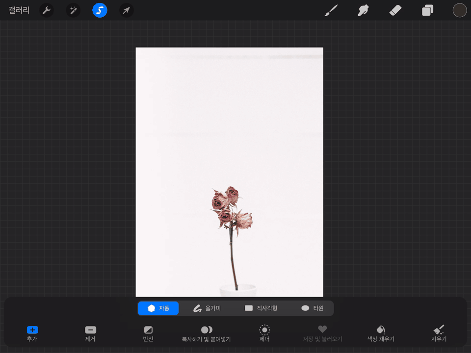 ▼ 아이패드 드로잉 어플인 프로크리에이트에서 배경 지우는 방법을 알아보겠습니다. 먼저 사진을 불러와주세요. (배경이 단색일수록 좋습니다) 그리고 왼쪽 상단에서 세 번째에 있는 [선택] 툴을 누릅니다.