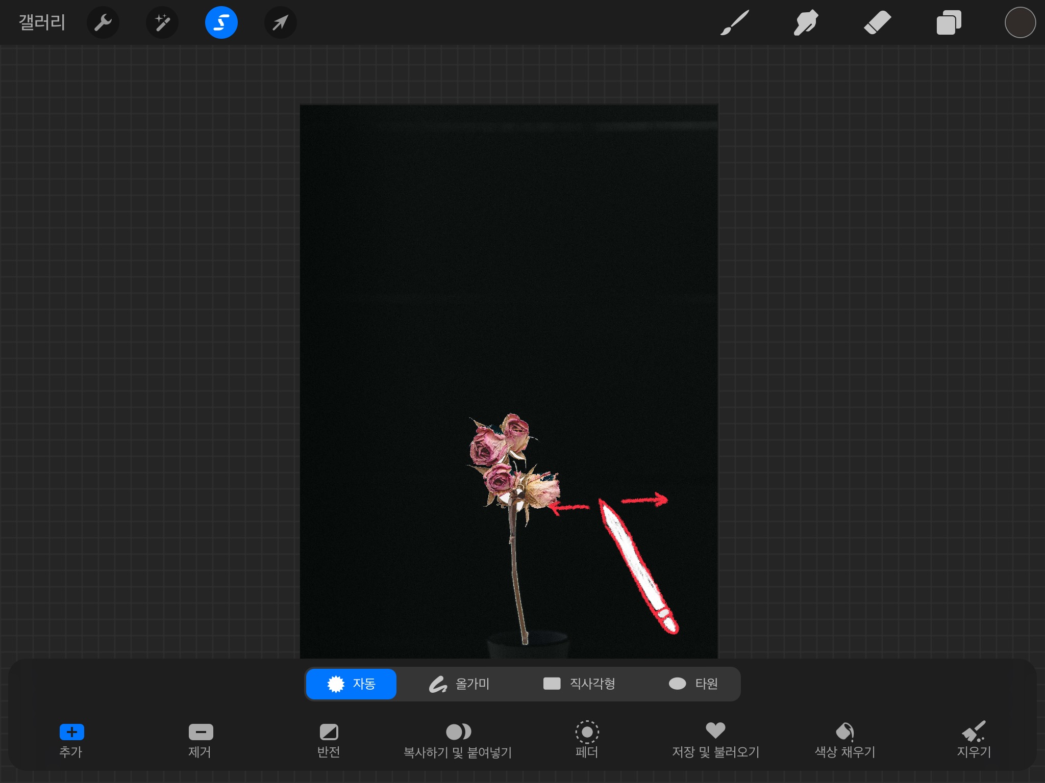 ▼ 그리고 애플 펜슬을 이용해서 배경 부분을 선택합니다. 이때 펜슬을 화면에서 떼지 않고 오른쪽 왼쪽을 움직이면 강약 조절을 할 수 있습니다.