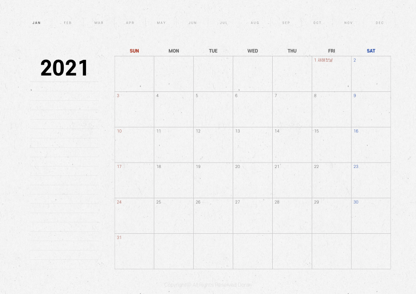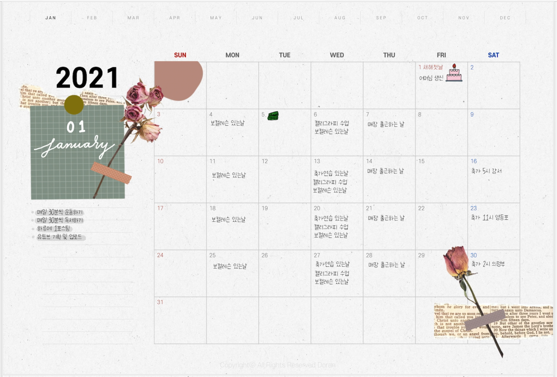 안녕하세요 도란입니다. 오늘은 아이패드 굿노트에서 사용 가능한 2021 먼슬리 다이어리를 가지고 왔습니다 :) 가장 중요하게 변경된 사항은 바로 A4사이즈입니다. 늘 4:3 비율의 속지를 공유했는데, 이번에는 A4 사이즈로 만들어보았습니다. 위클리 없이 먼슬리만 필요한 분들에게 유용한 속지가 되었으면 좋겠습니다.