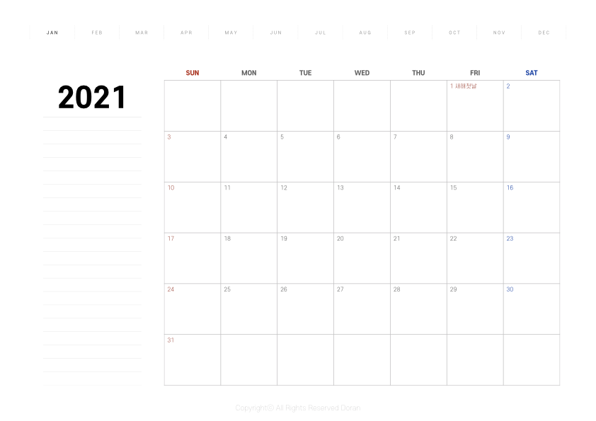 안녕하세요 도란입니다. 오늘은 아이패드 굿노트에서 사용 가능한 2021 먼슬리 다이어리를 가지고 왔습니다 :) 가장 중요하게 변경된 사항은 바로 A4사이즈입니다. 늘 4:3 비율의 속지를 공유했는데, 이번에는 A4 사이즈로 만들어보았습니다. 위클리 없이 먼슬리만 필요한 분들에게 유용한 속지가 되었으면 좋겠습니다.