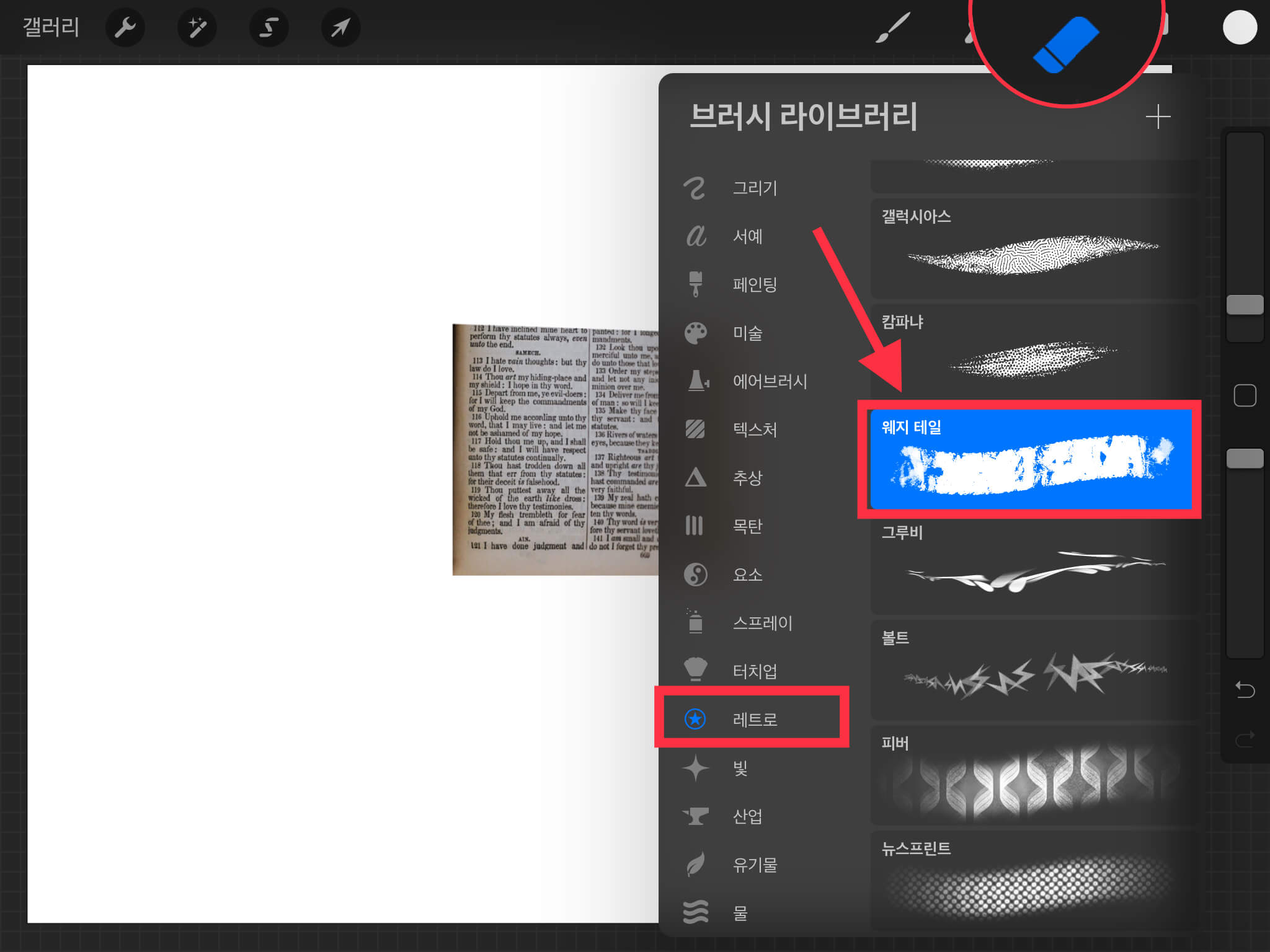 ▼ 찢어진 종이 효과를 내기 위해서 [지우개] - [레트로] - [웨지 테일]을 선택합니다. (브러시 선택은 개인의 느낌에 따라 다를 수 있습니다.)