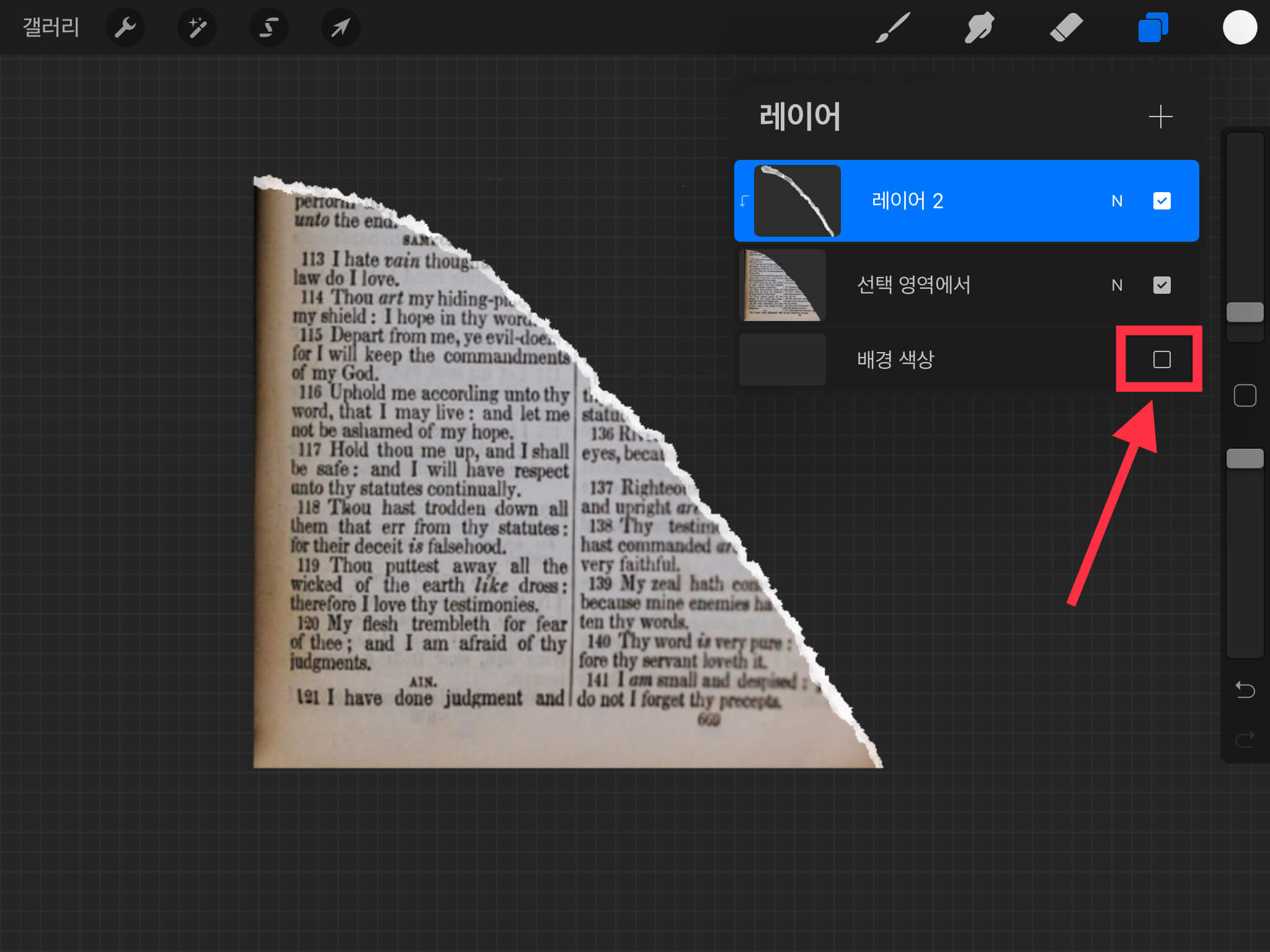 ▼ 끝까지 그려주고 나면 아래와 같이 찢어진 종이 느낌이 납니다. [배경 색상] 레이어를 해제하면 훨씬 눈에 잘 보입니다.