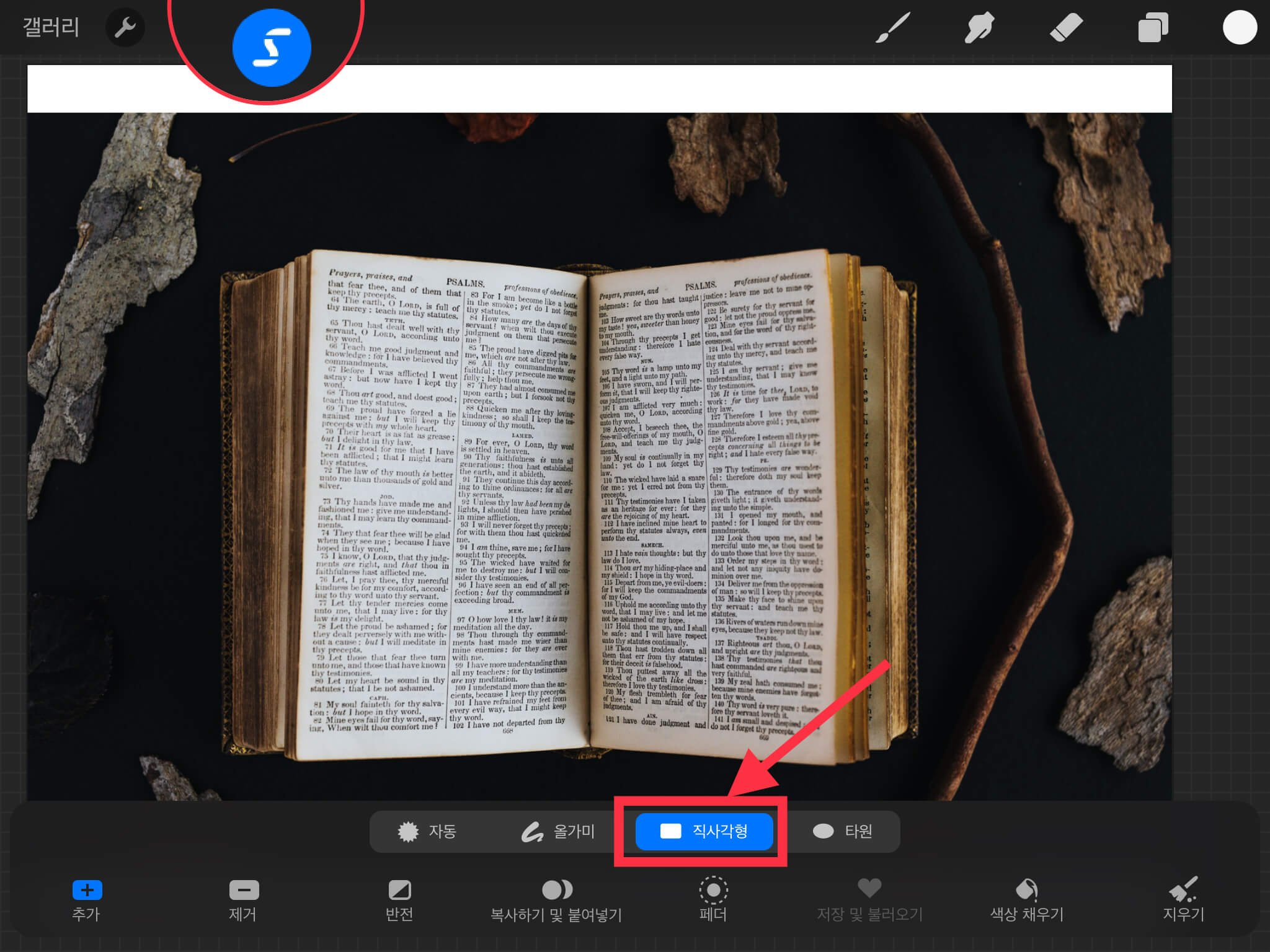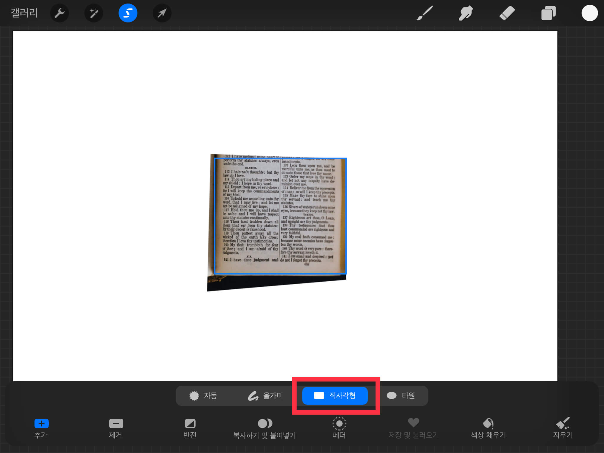 ▼ 또 다시 필요 없는 부분들을 없애주기 위해서 [선택]을 누르고 [직사각형]을 선택한 뒤, 필요한 부분만 잘라줍니다.