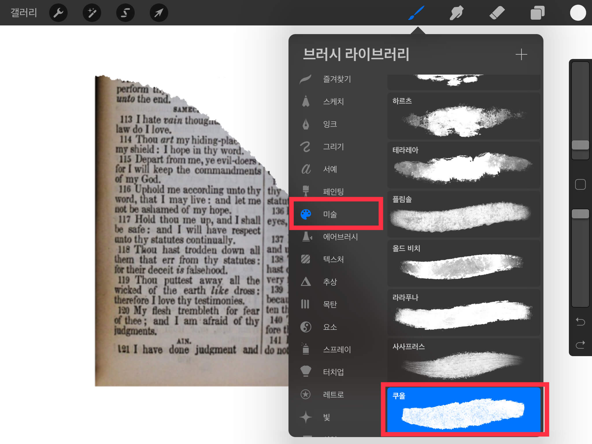 ▼ 이번에는 [브러시툴]을 선택한 뒤, [미술] - [쿠올] 브러시를 선택해주세요.