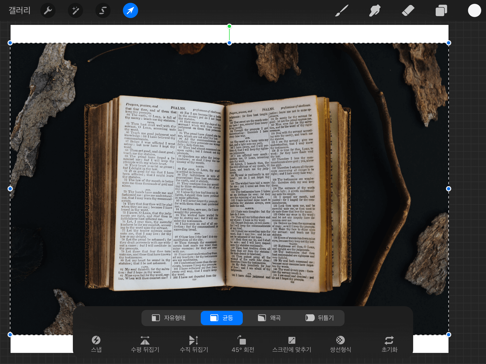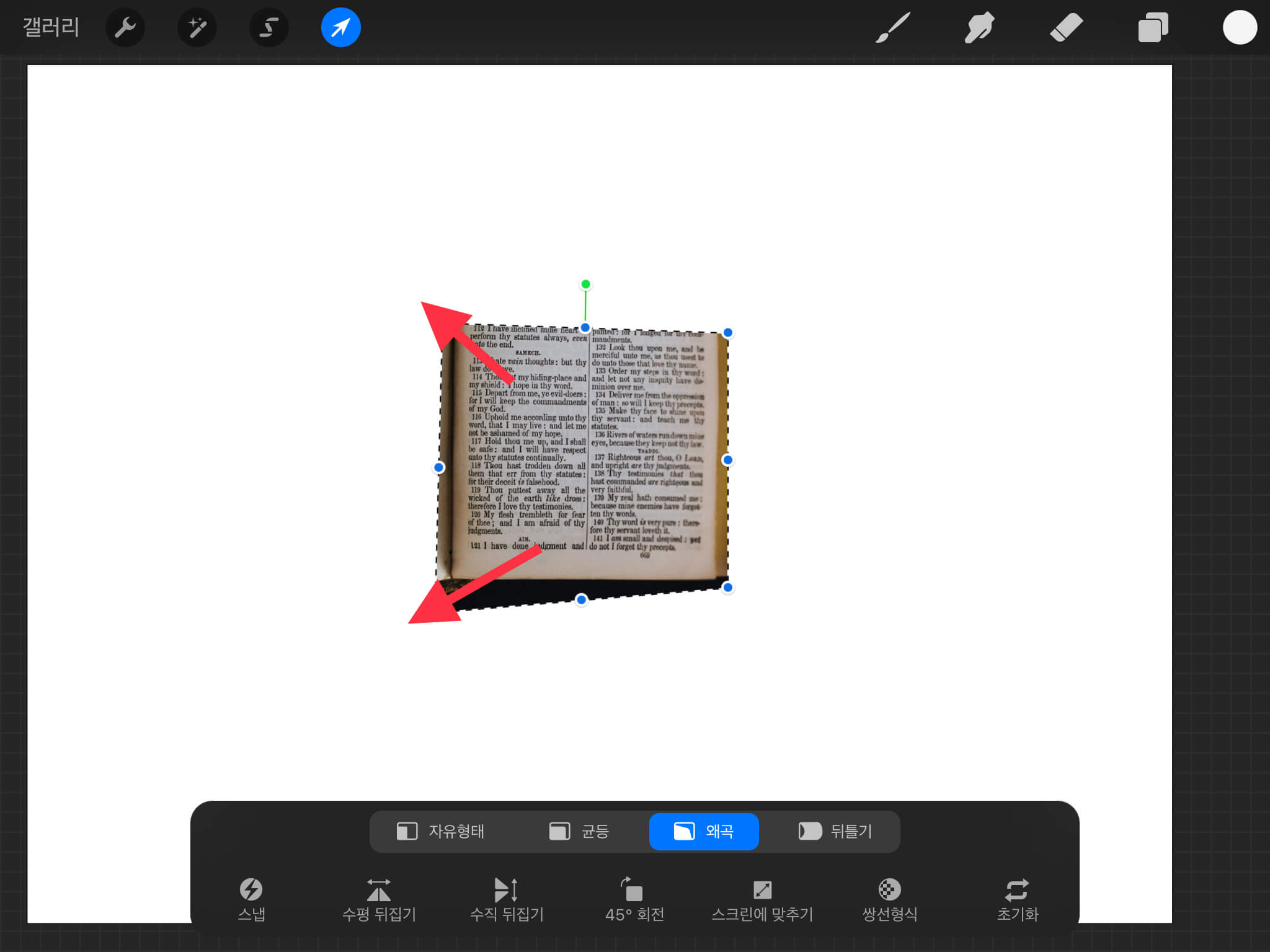 ▼ 영어책을 정면으로 만들어주기 위해, 상단 화살표 버튼을 누르고 [왜곡]을 선택합니다.