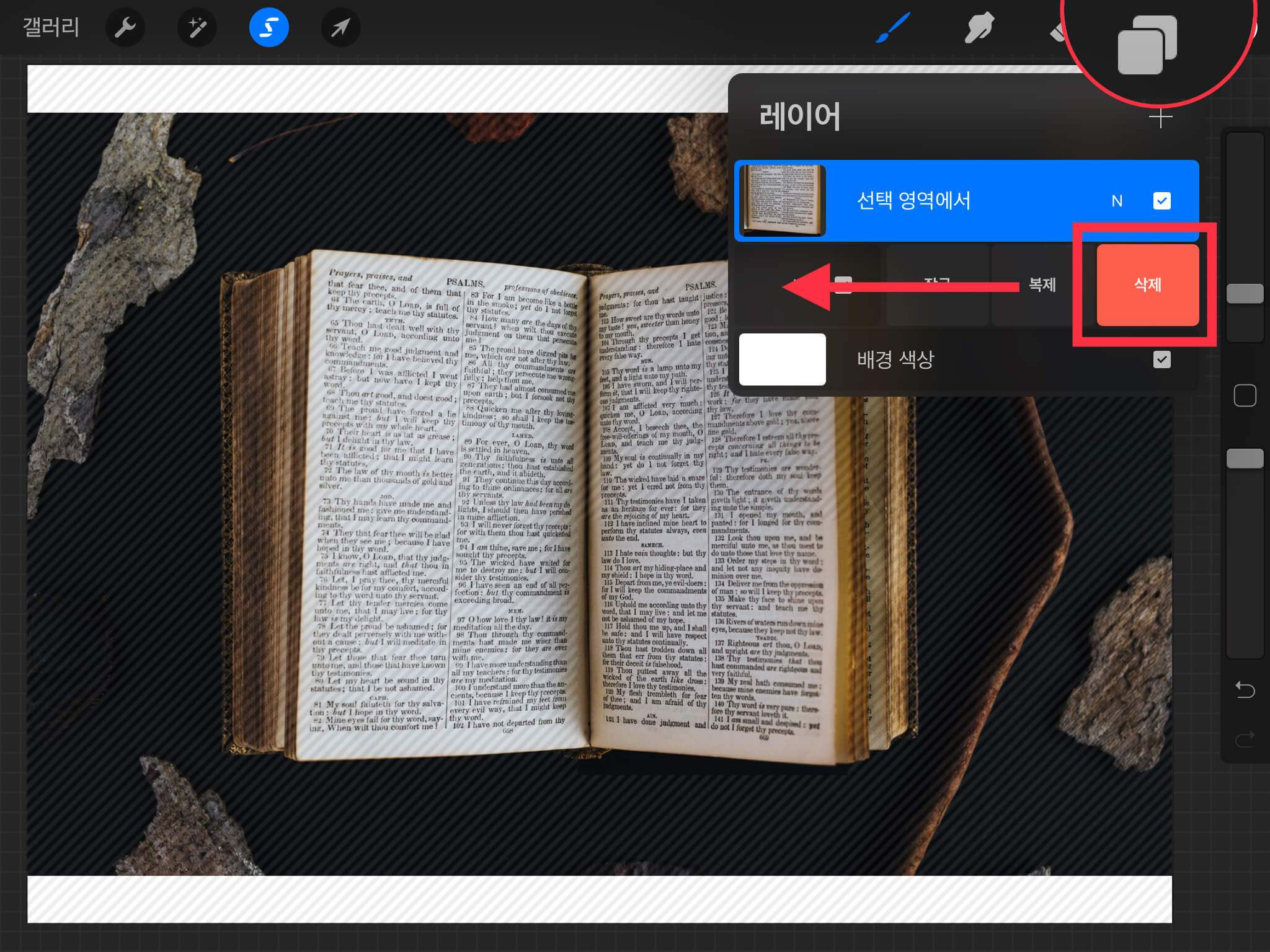 ▼ 아까와 마찬가지로 원본이 있는 레이어는 왼쪽으로 쓱 밀어서 삭제를 눌러주세요.