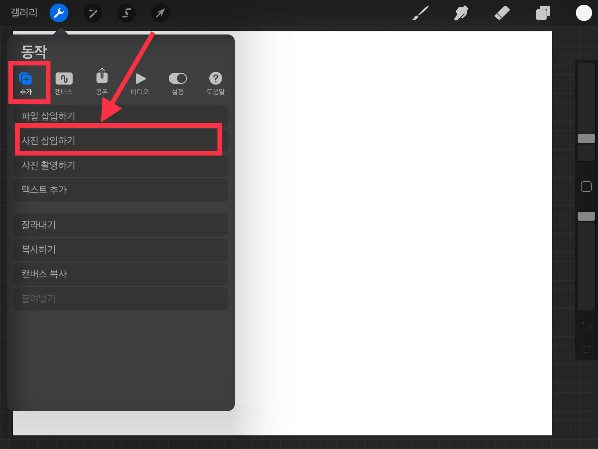 ▼ 프로크리에이트 새로운 캔버스를 열어주세요. 그리고 왼쪽 상단의 [동작] - [추가]를 선택한 뒤, 사진 삽입하기를 눌러주세요.