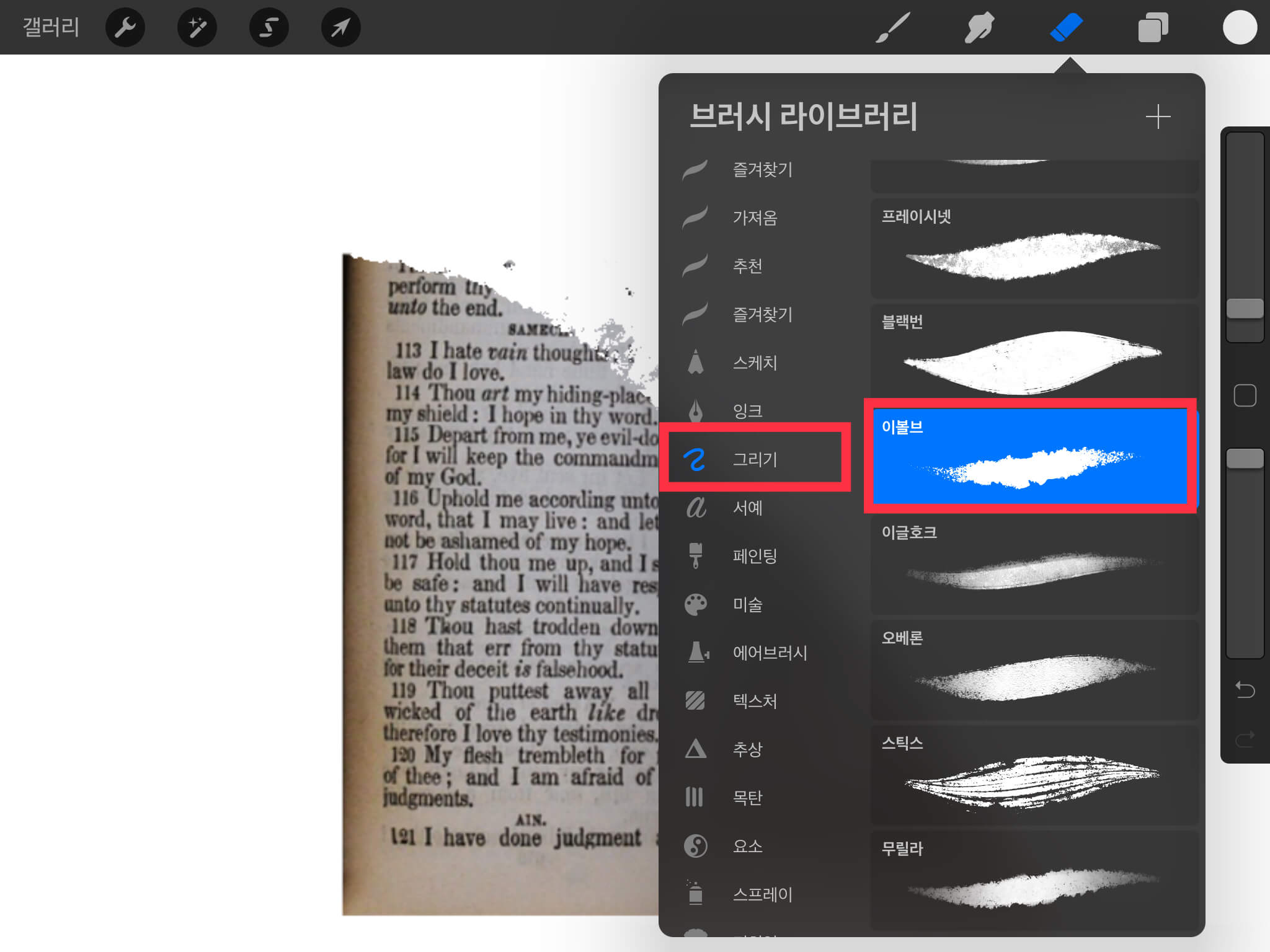 ▼ 디테일하게 지워주기 위해, 추가로 [그리기] - [이볼브] 브러시를 선택합니다.