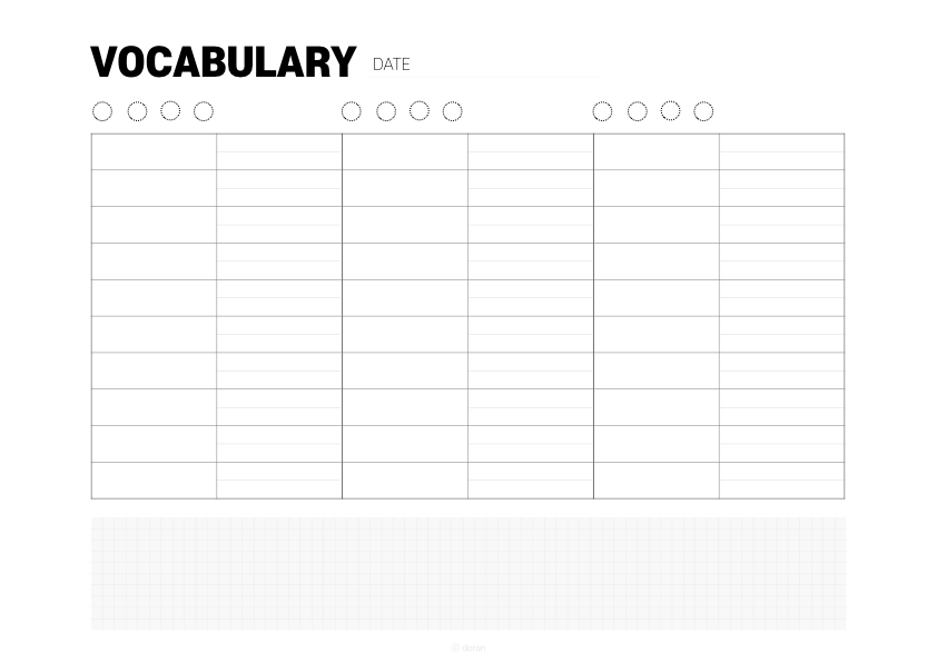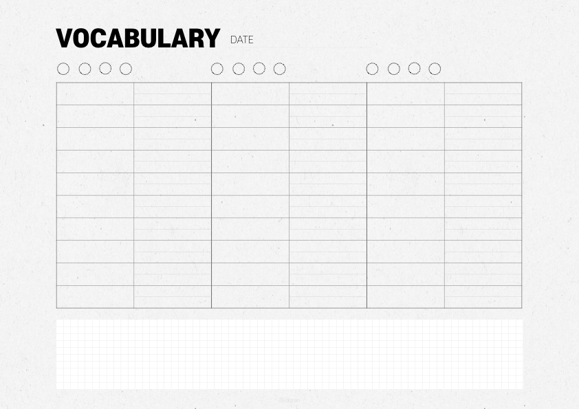 흰색 바탕과 종이질감 두가지 종류입니다. 한 줄에 세로로 10 단어까지 적을 수 있습니다. 총 세줄로 되어있으며 각 상단에는 반복 횟수를 적을 수 있도록 동그라미 네 개를 그려놓았습니다.