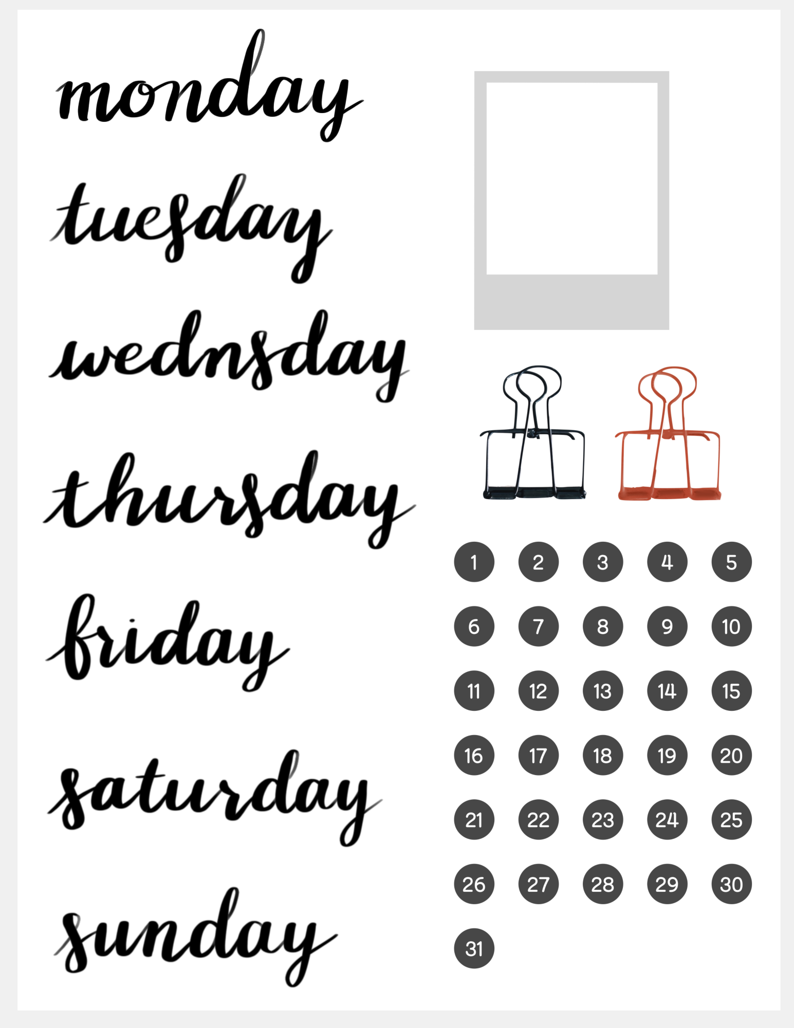 ▼ 영문 캘리그라피와 함께 제가 다이어리를 적을 때 사용한 스티커도 넣었습니다. 폴라로이드 도형과, 클립 2종, 날짜 스티커입니다. 여기서 클립 2종 중에 오른쪽 색상은 제가 칠한 거라서 자세히 보면 예쁘지 않으니 조그맣게 사용하세요 ㅎㅎㅎ