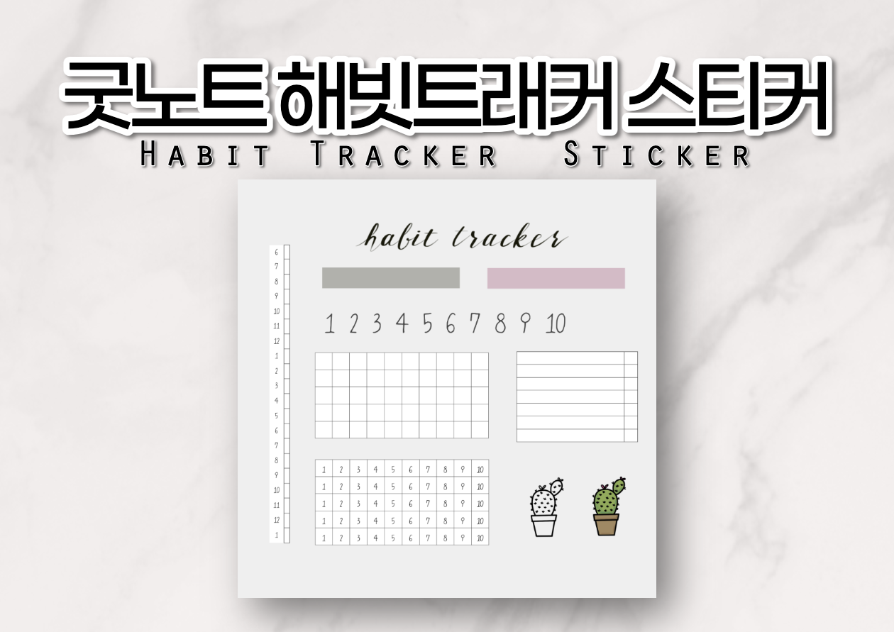 오늘 공유하려고 하는 해빗트래커 스티커는 불렛저널에 이용해도 좋지만, 일반 다이어리에 붙여도 좋을 것 같습니다. 왼쪽에 있는 타임테이블은 시간 부분에 하이라이터로 표시하면서 사용하면 됩니다. 그리고 맨 위에 영문 글귀 아래에 있는 마스킹 테이프는 반투명입니다. 그 아래에 있는 빈 모눈종이에는 숫자를 적을 수 있습니다. 자신이 원하는 만큼의 횟수를 적으면 좋을 것 같습니다. 그 아래에 숫자가 적혀 있는 것을 사용해도 됩니다 :)