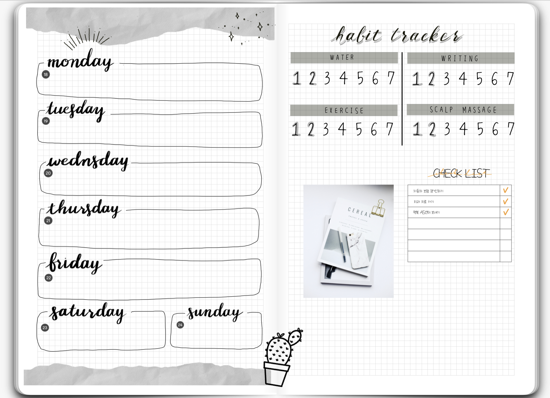 이렇게 심플하게 위클리 플래너를 꾸며보았는데요. 완벽하지 않더라도 매번 이렇게 작성하다보면 나만의 생활패턴을 알게 되는 것 같습니다. :)