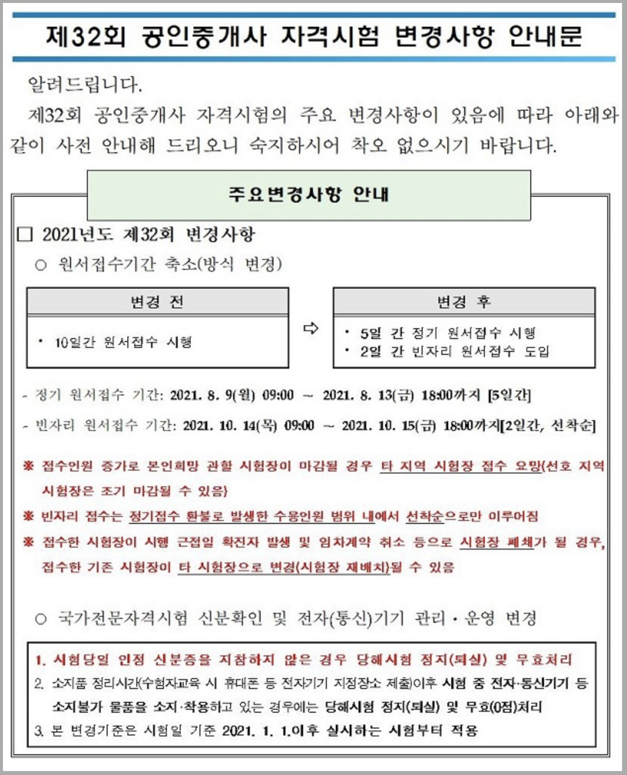 공인중개사 시험 빈자리 접수정기접수 환불로 발생한 수용인원 범위 내에서 선착순으로 이루어진다고 합니다. [2021년 10월 14일 (목) 9:00 ~ 2021년 10월 15일(금) 18:00 까지 2일간, 선착순] 정기접수 기간에 접수하지 못한 분들은 추가 접수기간에 미리 준비를 하여 신청을 하면 될 것 같습니다.