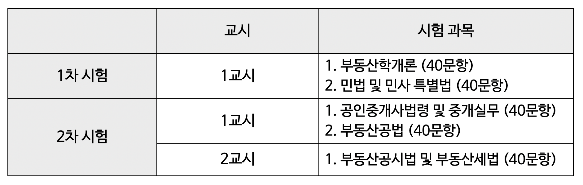 공인중개사 시험은 총 1차 시험과 2차 시험으로 나뉩니다. 오전에는 1차 시험을 보고 오후에는 2차 시험을 봅니다. 사이에는 점심시간이 있습니다. 1차 시험은 1교시만 있습니다. 1차 시험 1교시에는 부동산학개론, 민법 및 민사 특별법 시험을 봅니다. 그리고 2차 시험은 총 2교시가 있습니다. 2차 시험 1교시에는 공인중개사 법령 및 중개실무, 부동산 공법을 봅니다. 그리고 마지막으로 2차 시험 2교시에는 부동산 공시법 및 부동산 세법을 봅니다.