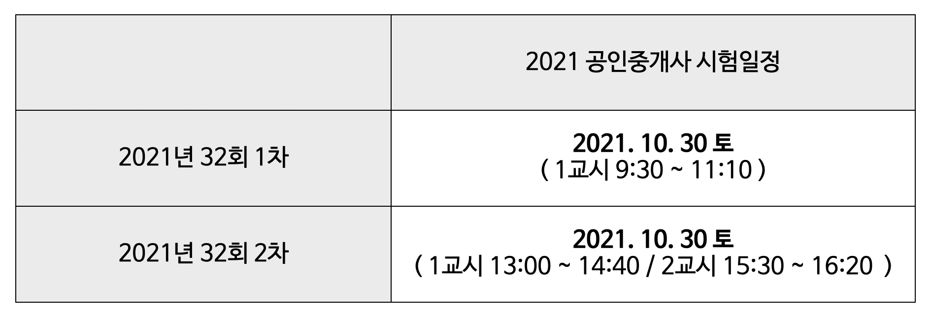 2021년 제 31회 공인중개사 시험일은 2021년 10월 30일 토요일입니다.