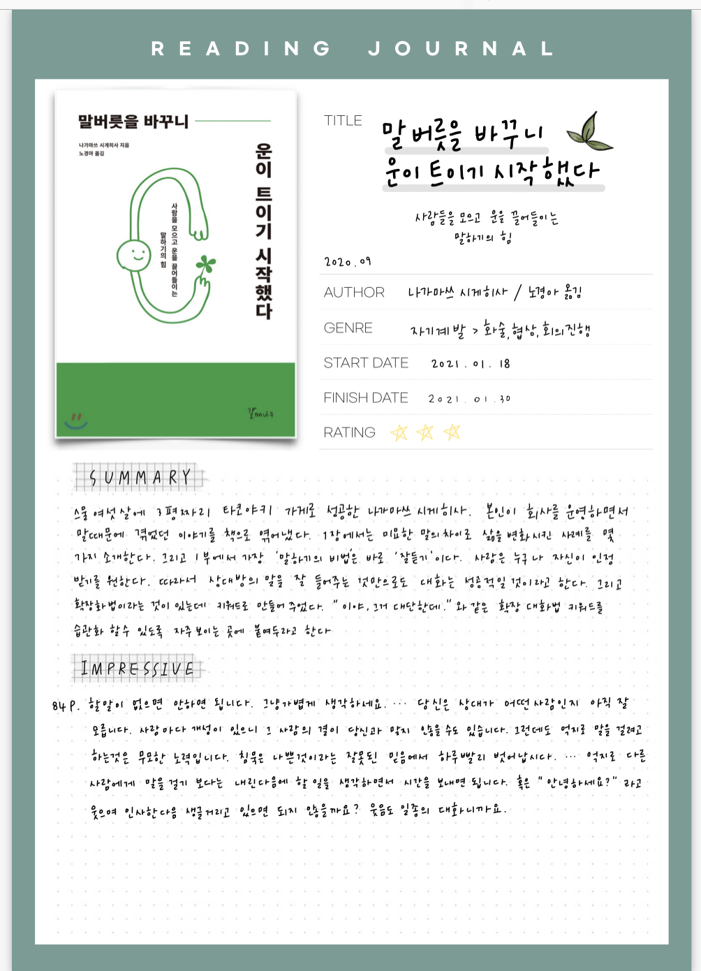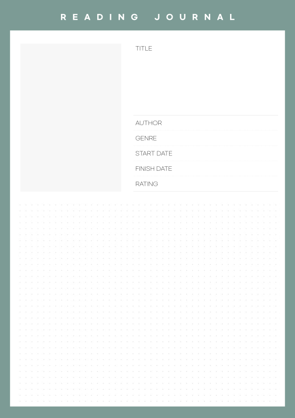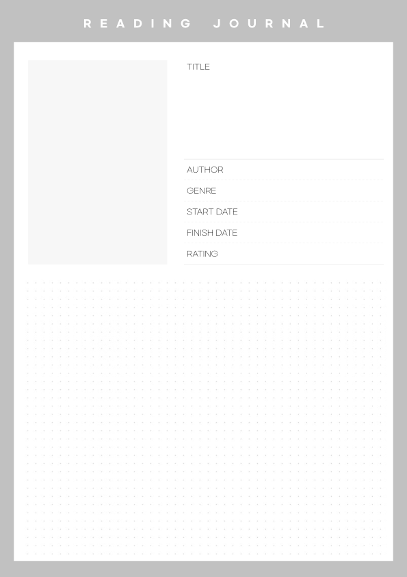 왼쪽 상단에는 책 이미지를 넣을 수 있고, 오른쪽 상단에는 타이틀을 넣을 수 있습니다. 책 제목을 크게 써서 잘 보일 수 있도록 칸도 넓게 만들었습니다. 그다음에는 작가, 종류, 읽기 시작한 날짜, 마친 날짜, 평점까지 차례로 적을 수 있습니다.