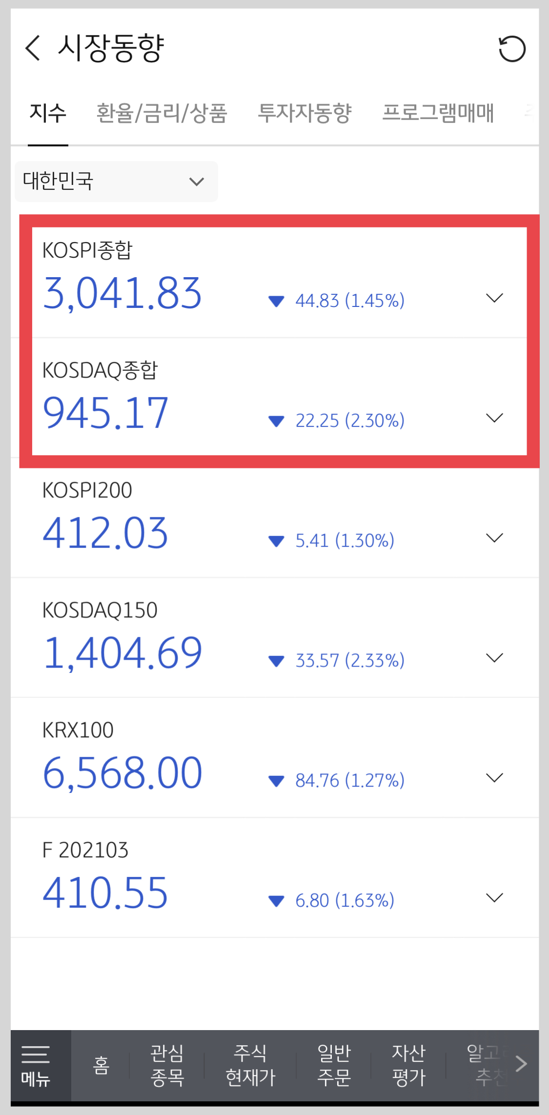 ▼ 홈 화면에 나와있는 주요지수를 눌러주세요.