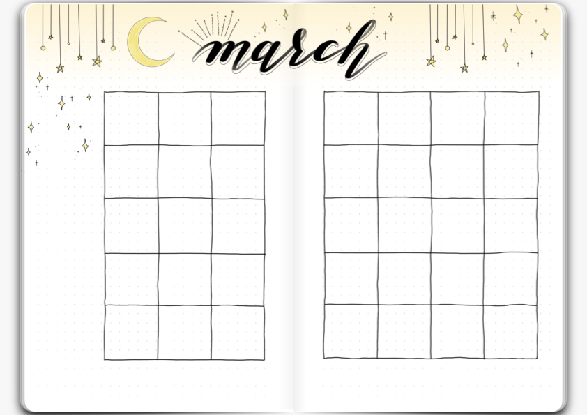이번 3월 먼슬리 속지의 테마는 달과 별입니다. 가장 쉽게 접근할 수 있는 테마였어요. 불렛 저널을 반짝이로 꾸며주었더니 예쁘더라고요.