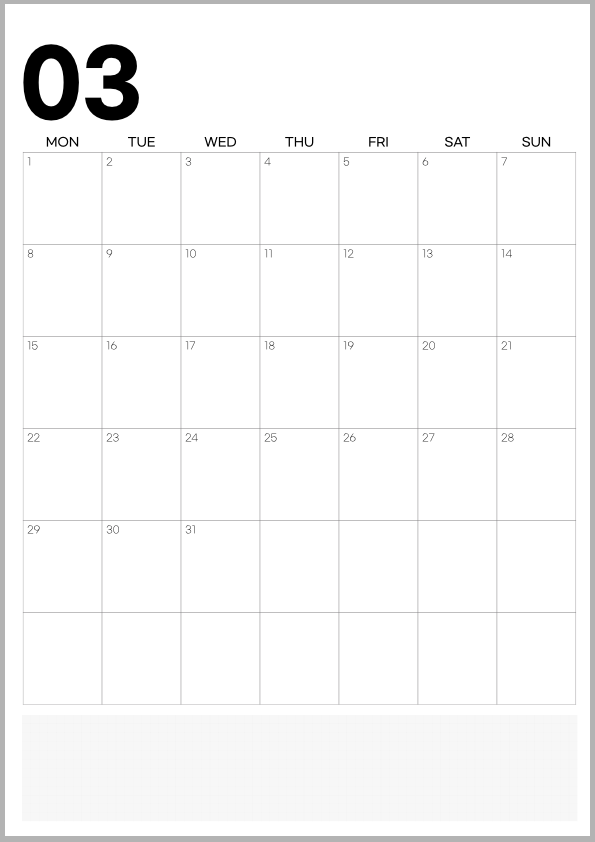 월요일 시작과 일요일 시작. 총 두 가지 버전으로 만들어 보았습니다. 세로의 특성상 안에 들어간 표도 세로로 길게 만들어 보았습니다. 개인적으로 평소에 가로로 사용하다가 세로형을 보니 더욱 큼지막한 느낌이 드는 것 같습니다.