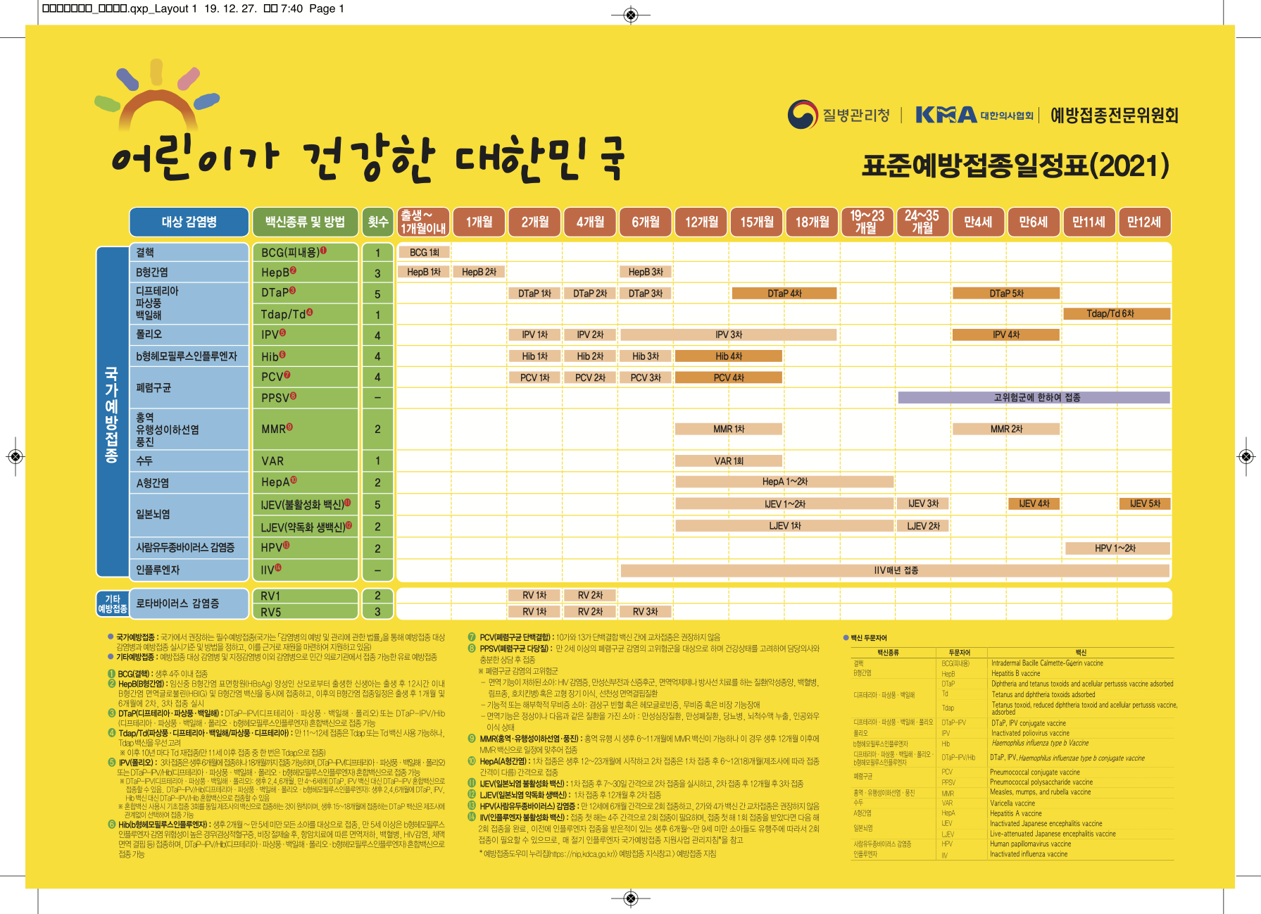아이가 태어나면 일정에 잘 맞추어 예방접종을 해주어야 합니다. 병원에서 잘 관리를 해주지만 아이가 클수록 예방접종을 놓치는 경우가 생깁니다. 질병관리본부에서 제공하는 예방접종 일정표를 참고하셔서 아이들 예방접종을 놓치지 않도록 하면 좋을 것 같네요.