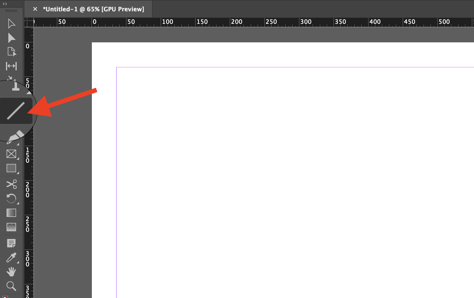 ▼ 인디자인에서 직선을 그리기 위해서는 왼쪽에 있는 Line Tool (라인 툴)을 선택해줍니다. 단축키는 엔터키 위에 있는 \ (백슬래시)입니다