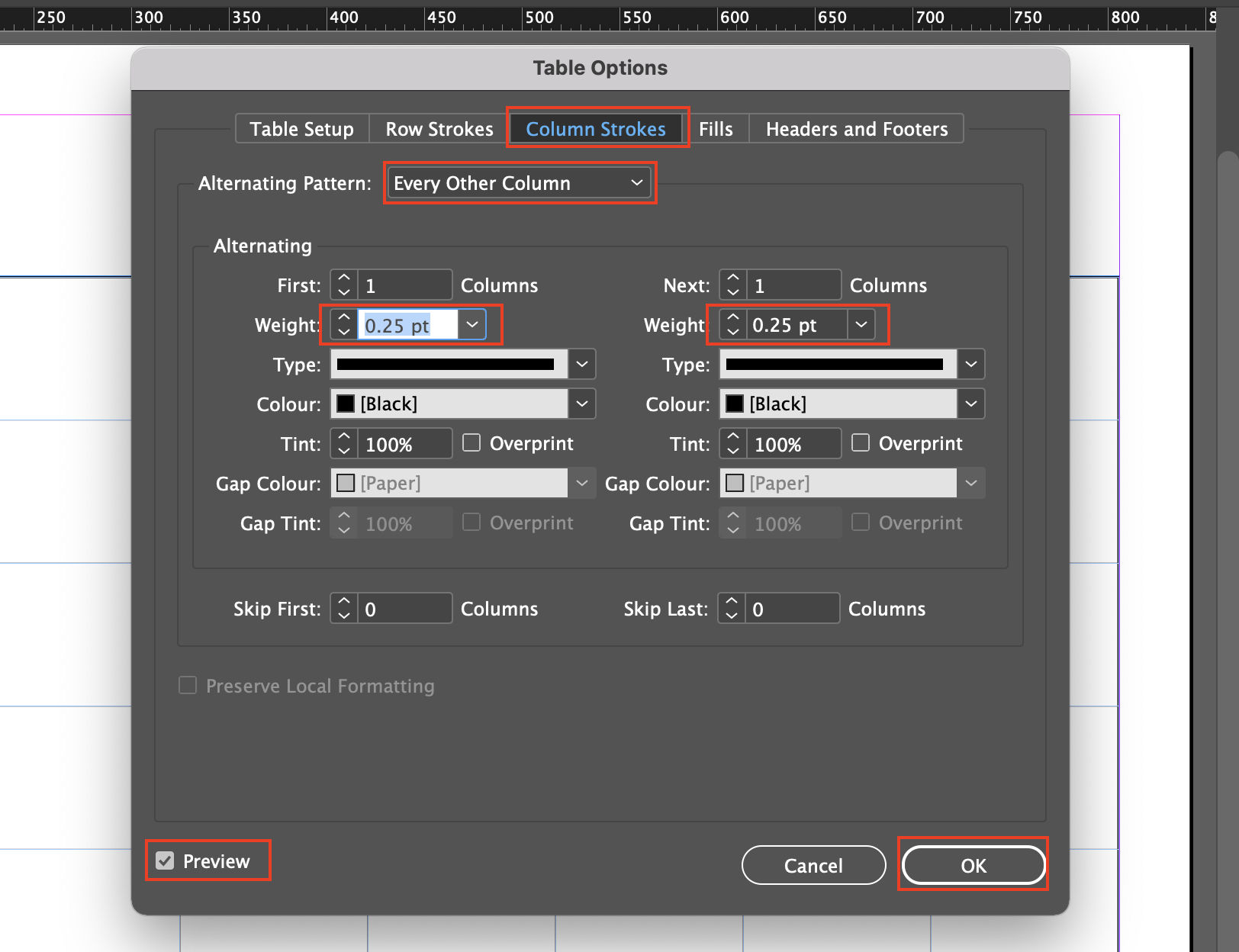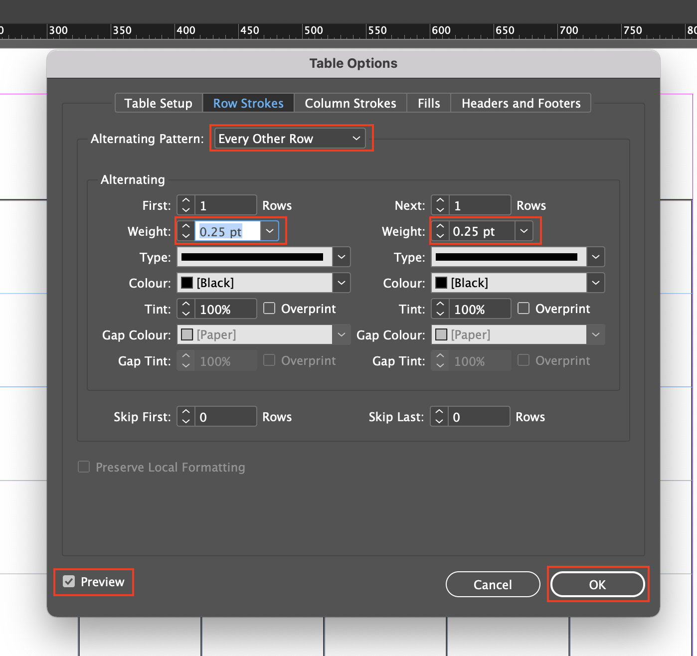 ▼ Alternating Pattern 설정을 Every Other Row로 선택한 뒤, 양쪽에 있는 Weight 값을 0.25pt로 만들어 줍니다. 변경된 두께를 미리 보기 위해서 아래 Preview를 활성화합니다. 그리고OK 버튼을 누릅니다.