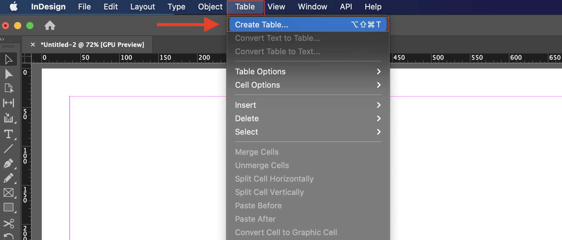 ▼ 인디자인을 실행하고 상단에 있는 메뉴에서 [Table] - [Create Table]을 선택합니다.