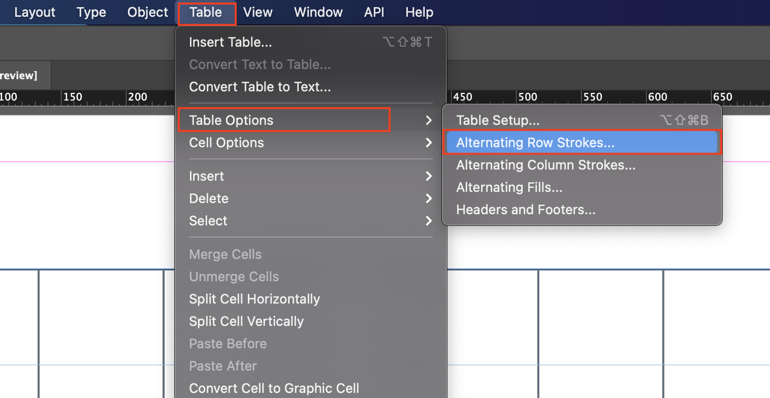 ▼ 표 안에 있는 라인은 기본적으로 1pt이기 때문에 굵다는 느낌이 듭니다. 그래서 내부 라인의 굵기를 0.25pt로 줄여주겠습니다. [Table] - [Table Options] - [Alternating Row Strokes]를 선택합니다.
