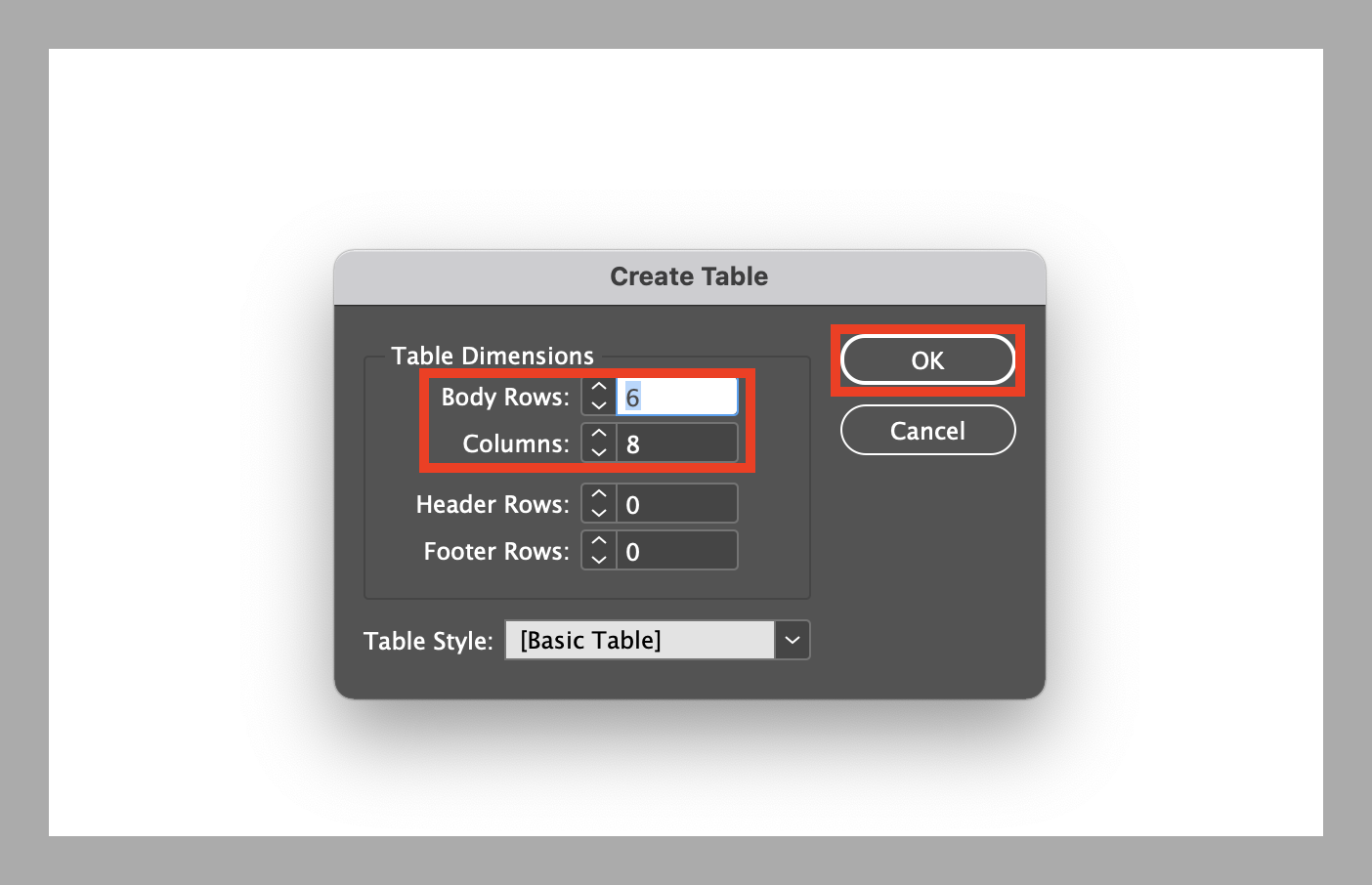 ▼ 테이블의 행과 열을 입력합니다. 먼슬리 다이어리를 만들기 위해서 Body Rows 6, Columns 8로 입력한 뒤 OK를 누릅니다. (메모칸 없이 일주일 표만 만들고 싶을 때에는 Columns값을 7로 해주세요.)