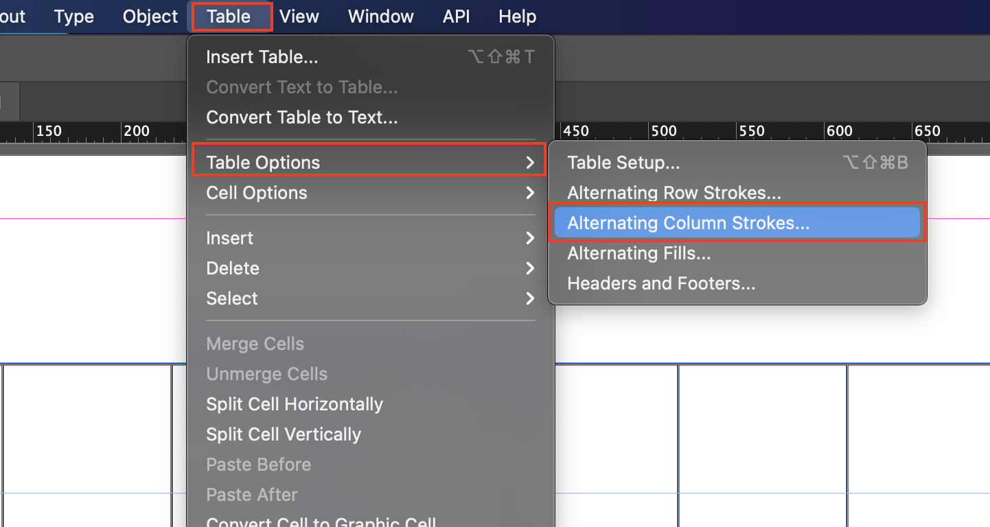 ▼ 세로 선의 두께를 변경하기 위해 [Table] - [Table Options] - [Alternating Column Strokes]를 선택합니다.