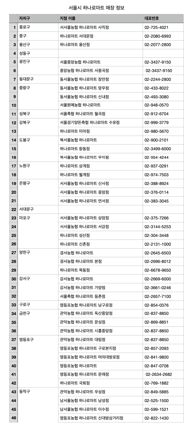 위 표는 하나로마트 매장 찾기 페이지를 참고하여 만들었습니다. 어서 빨리 코로나 19가 종식되길 바랍니다. 이상입니다.