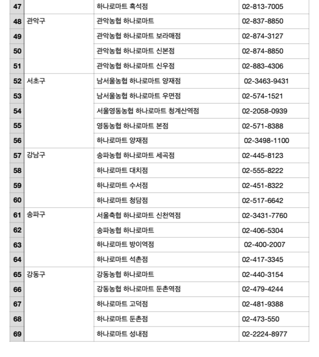 제가 직접 매장을 하나하나 찾아서 넣었기 때문에 오타가 있을 수 있으니, 잘못된 정보가 발견되면 댓글로 남겨주세요. 주소정보는 안 나와있는 매장들이 더 많아서 생략하였습니다. 매장 이름을 확인하시고, 지도에서 검색해도 됩니다. 그리고 아래 링크 하나로마트 매장 찾기에서 바로 찾아도 됩니다.