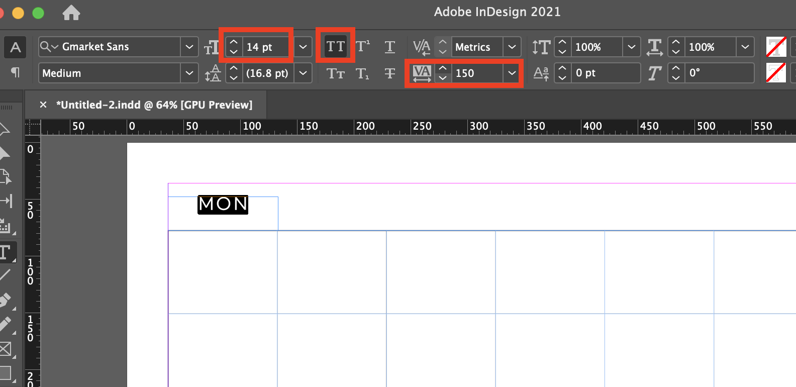 ▼ 그리고 폰트 크기도 14pt 정도로 키워주고, TT라고 적힌 아이콘을 눌러 대문자로 변경해준고, 글자간 간격도 150으로 설정해줍니다. (반드시 텍스트가 선택이 되어있어야 합니다)