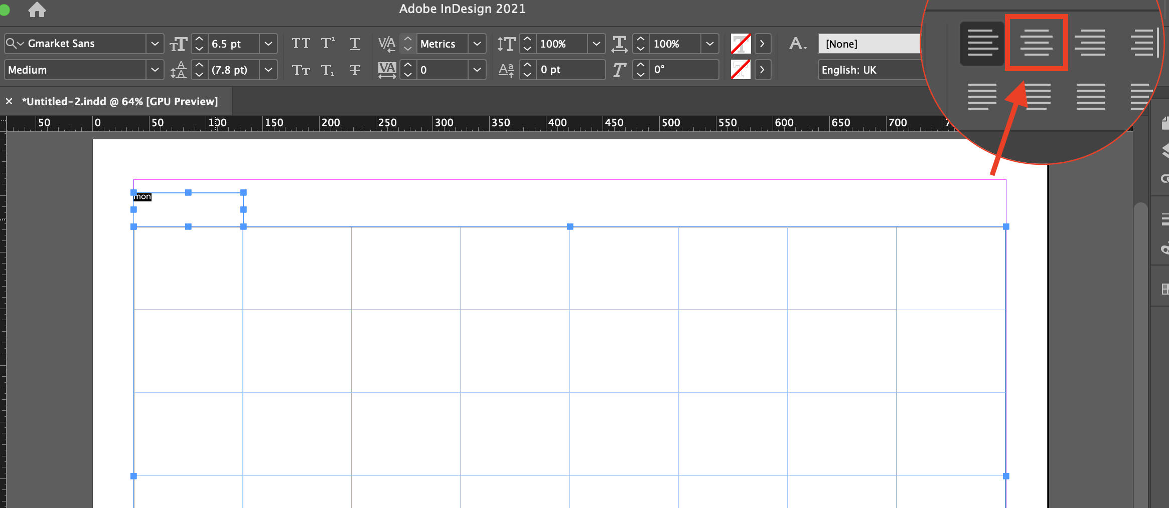 ▼ 아래와 같이 글씨가 왼쪽 정렬이 되어있을때에는, 텍스트 박스에 커서를 클릭하고 전체를 선택 드래그 해준 뒤(ctrl+A, 혹은 command+A) 오른쪽 상단의 컨트롤 패널에서 가운데 정렬을 눌러주세요.