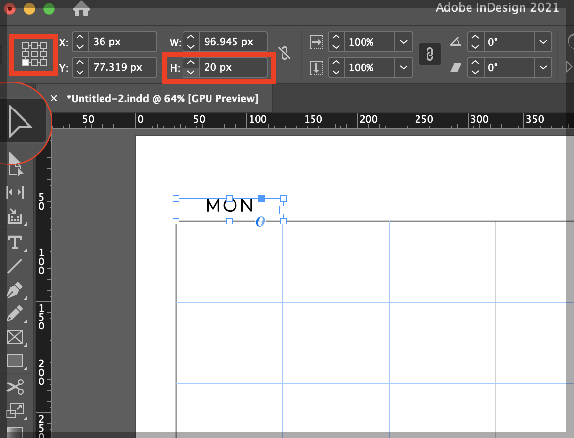▼ 표에서 거리가 먼 느낌이 들기 때문에 박스 크기를 줄여주도록 하겠습니다. 빈 곳에 커서를 클릭하고, 선택툴을 눌러 텍스트박스를 선택합니다. 그리고 왼쪽 상단 컨트롤 패널에서 바둑판처럼 생긴 네모를 아래와 같이 해주고, H (높이)를 20px로 줄여줍니다.