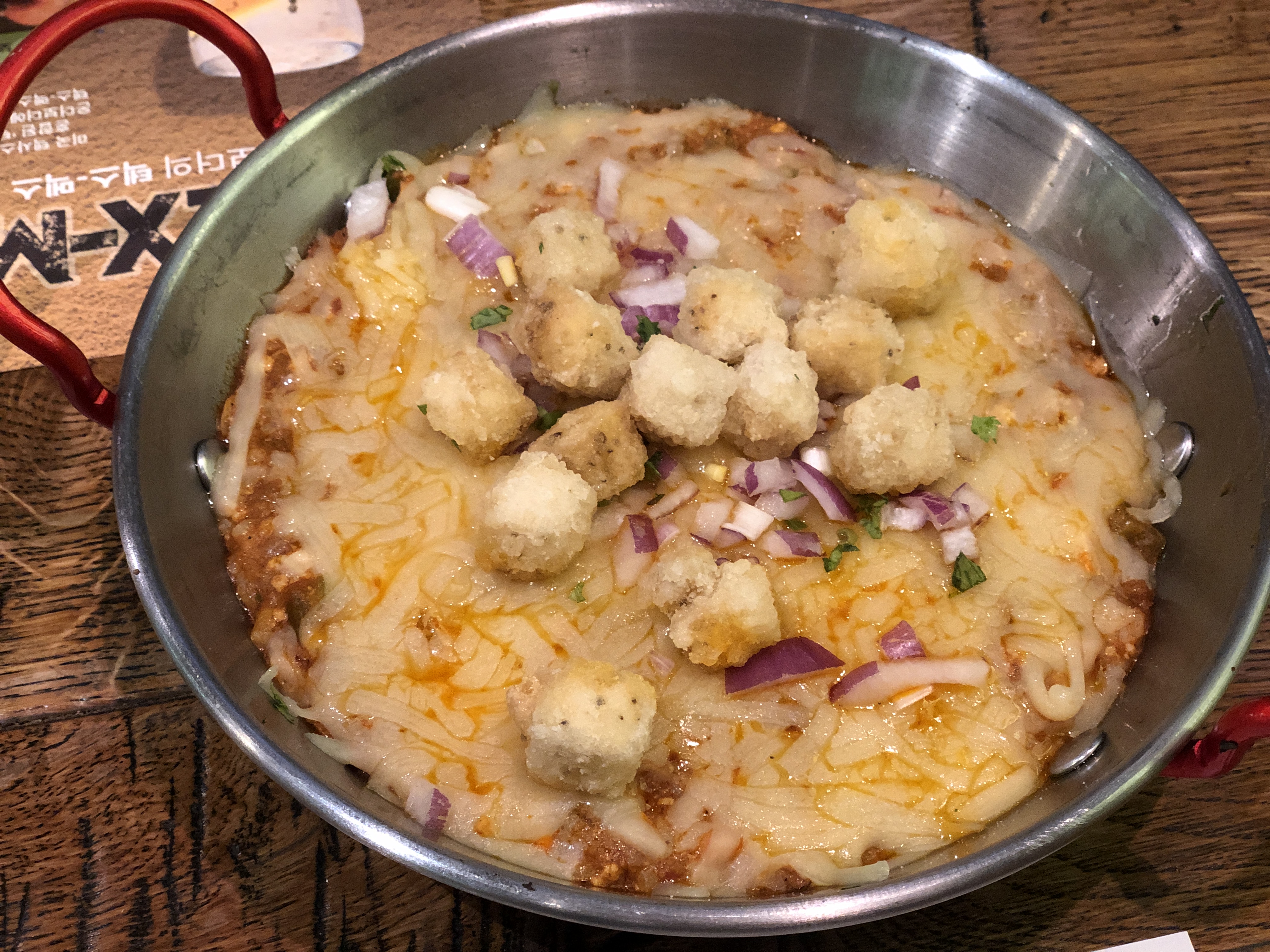 초리조란 스페인식 반건조 소시지를 말합니다. 으깬 두부와 초리조가 들어간 밥에 치즈가 얹어져 있습니다. 그리고 위에 보이는 튀김은 바로 두부 튀김인데 굉장히 쫄깃하고 맛있었습니다.