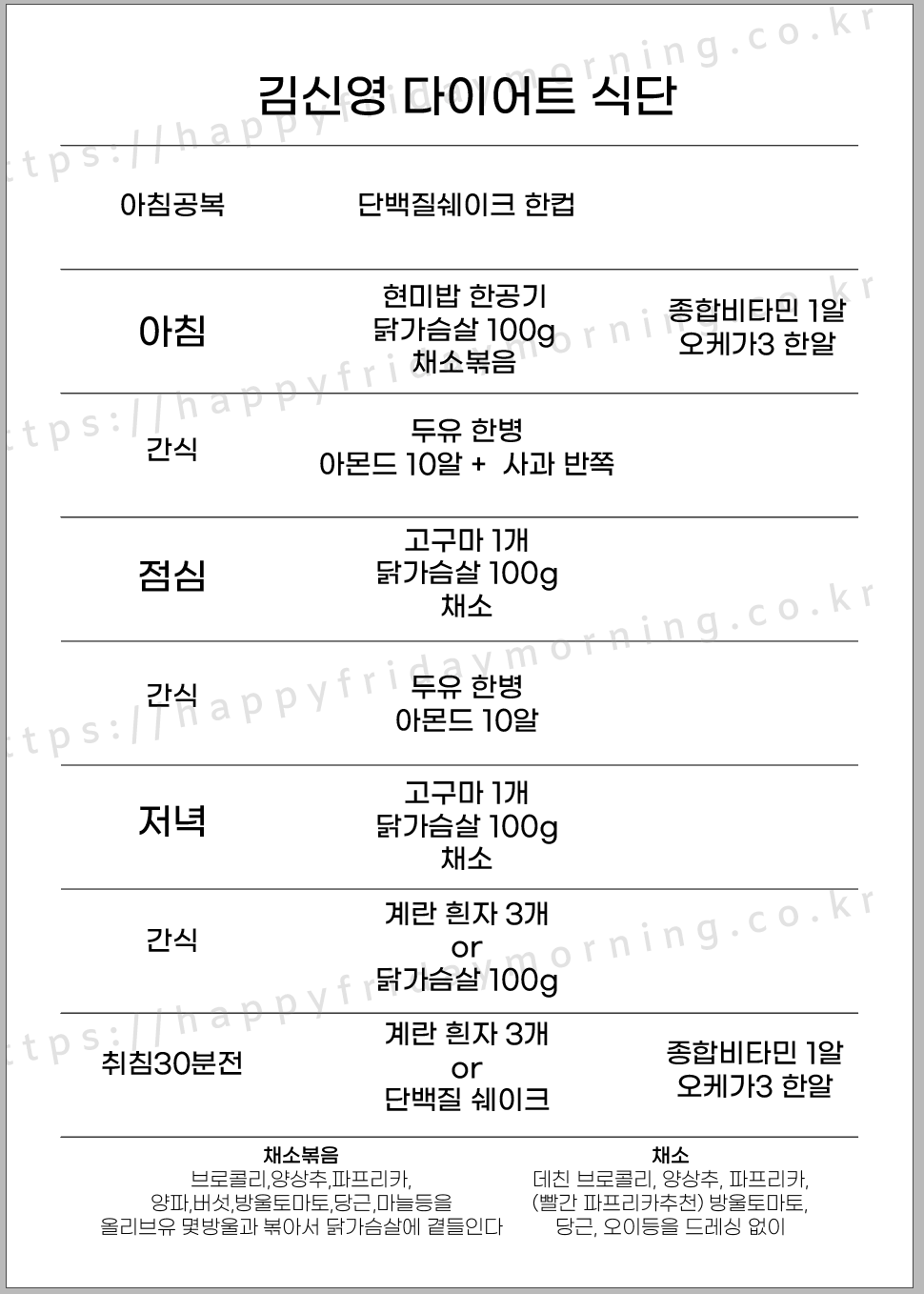 김신영의 다이어트 식단은 아침에 닭가슴살 채소볶음과 현미밥, 점심에 고구마와 닭가슴살과 채소, 저녁에 고구마와 닭가슴살, 채소를 먹는 것인데요. 간식으로는 단백질 셰이크와 아몬드, 달걀 3개, 볶은 콩 중 하나를 선택해 식사 후 중간 시간에 배가 고프면 먹는다고 합니다.