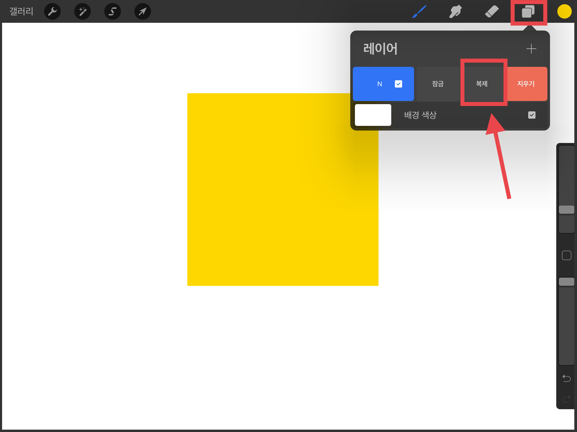 ▼ 이제 이 레이어를 복제해주세요. 복제하고자 하는 레이어를 오른쪽에서 왼쪽으로 슥 밀어주면 [복제]메뉴가 나옵니다. 선택하면 복제가 됩니다.
