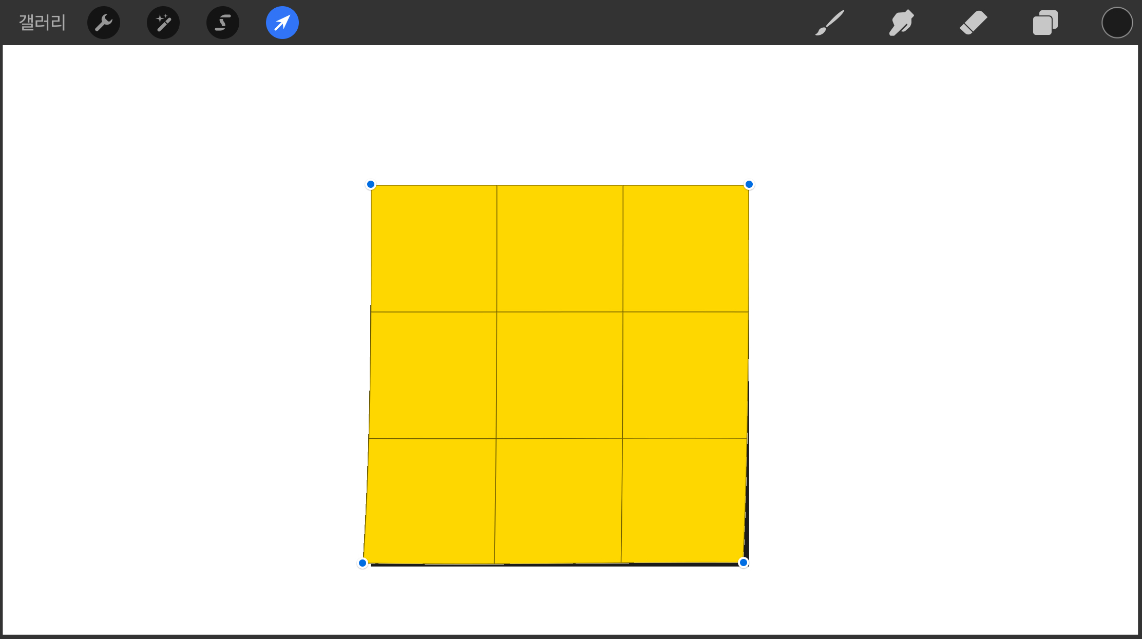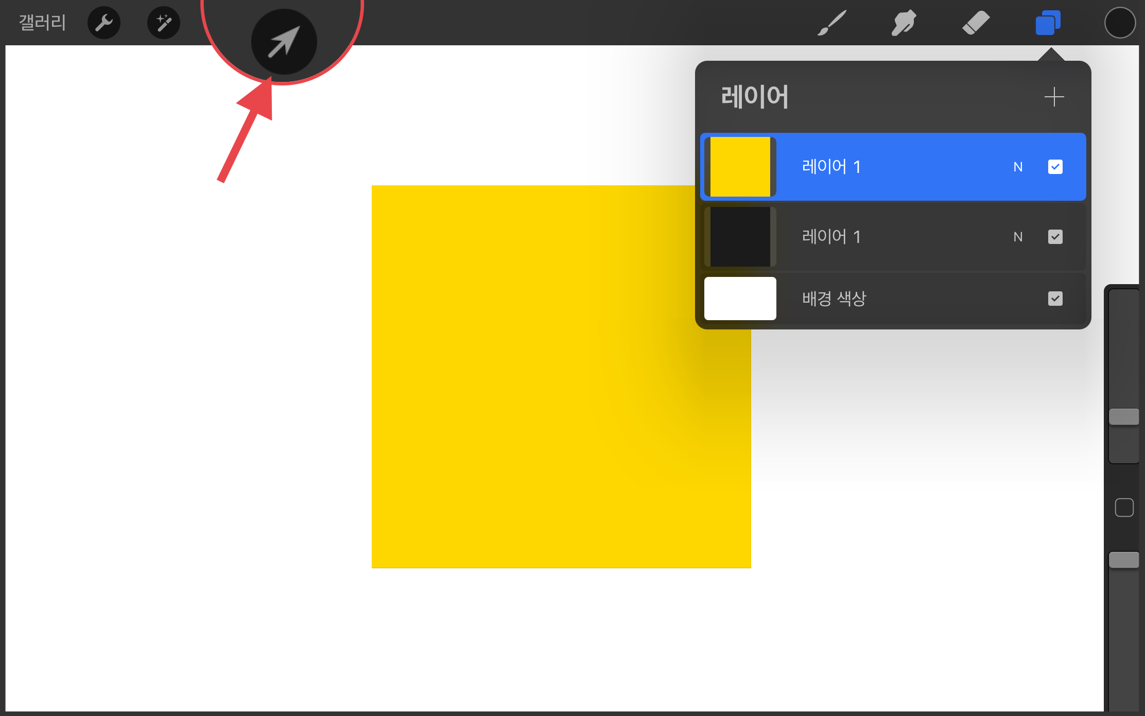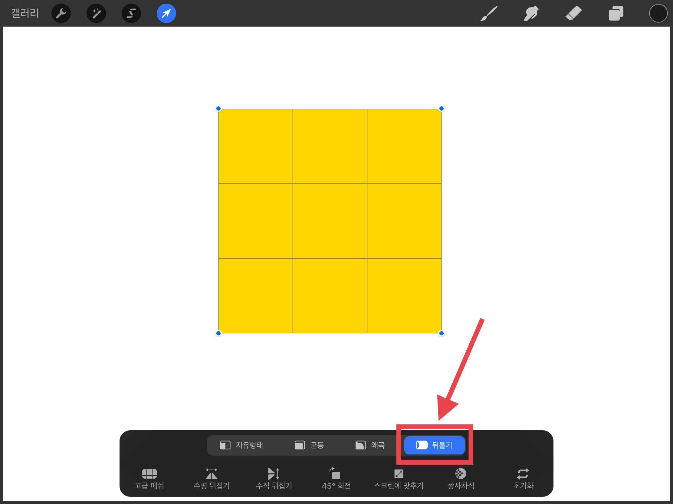 ▼ 이번에는 위에있는 노란색 레이어를 선택한 뒤 화살표 모양의 변환(Transform)메뉴를 선택합니다.