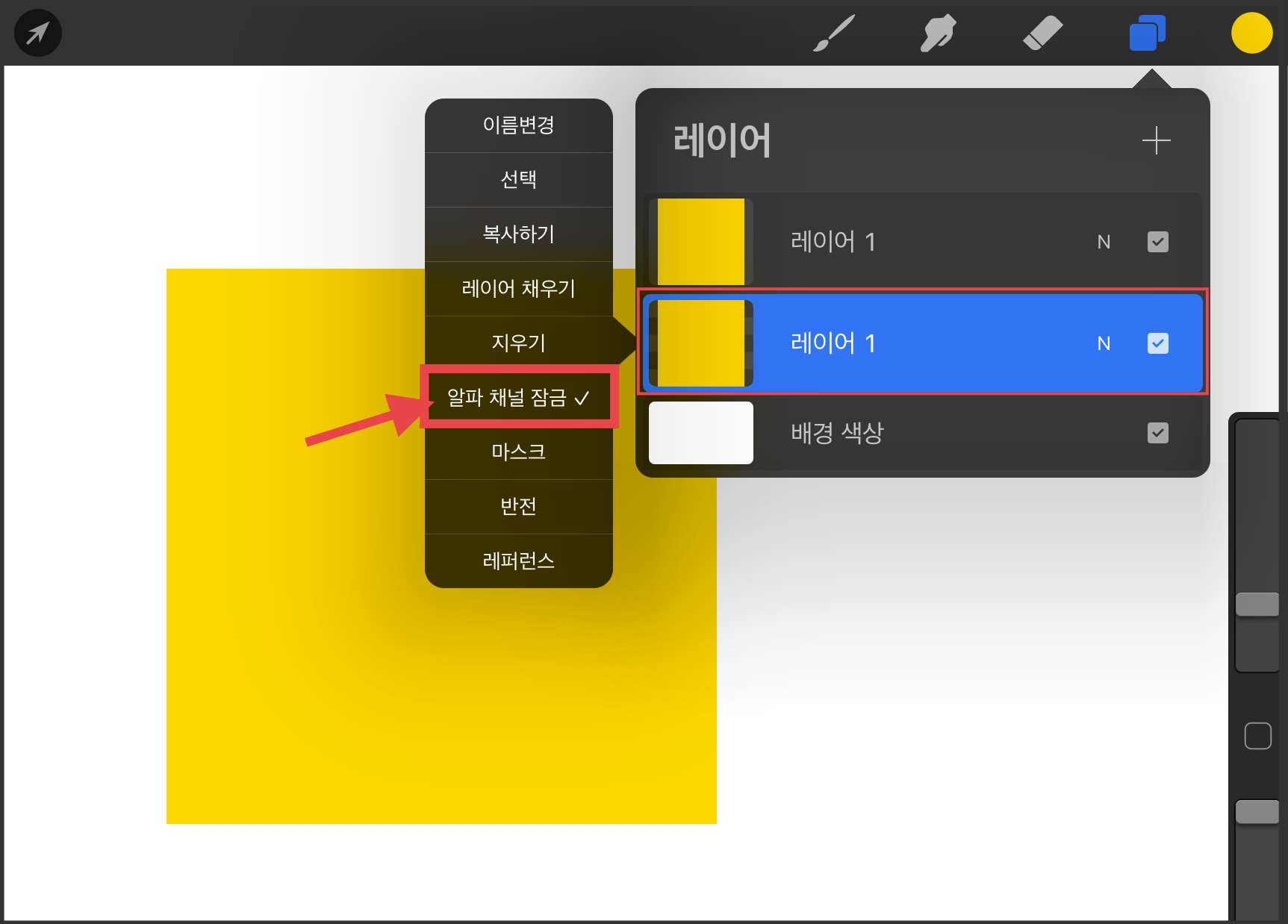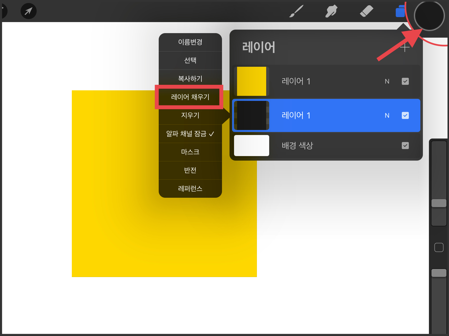 ▼ 색상에서 어두운 색상을 선택하고 [레이어 채우기] 해주세요. 그리고 [알파 채널 잠금 해제]를 해주세요. 레이어에서 색상이 검은색으로 변했지만, 아래에 있는 레이어이기 때문에 노란색에 가려져서 검은색이 보이지 않습니다.