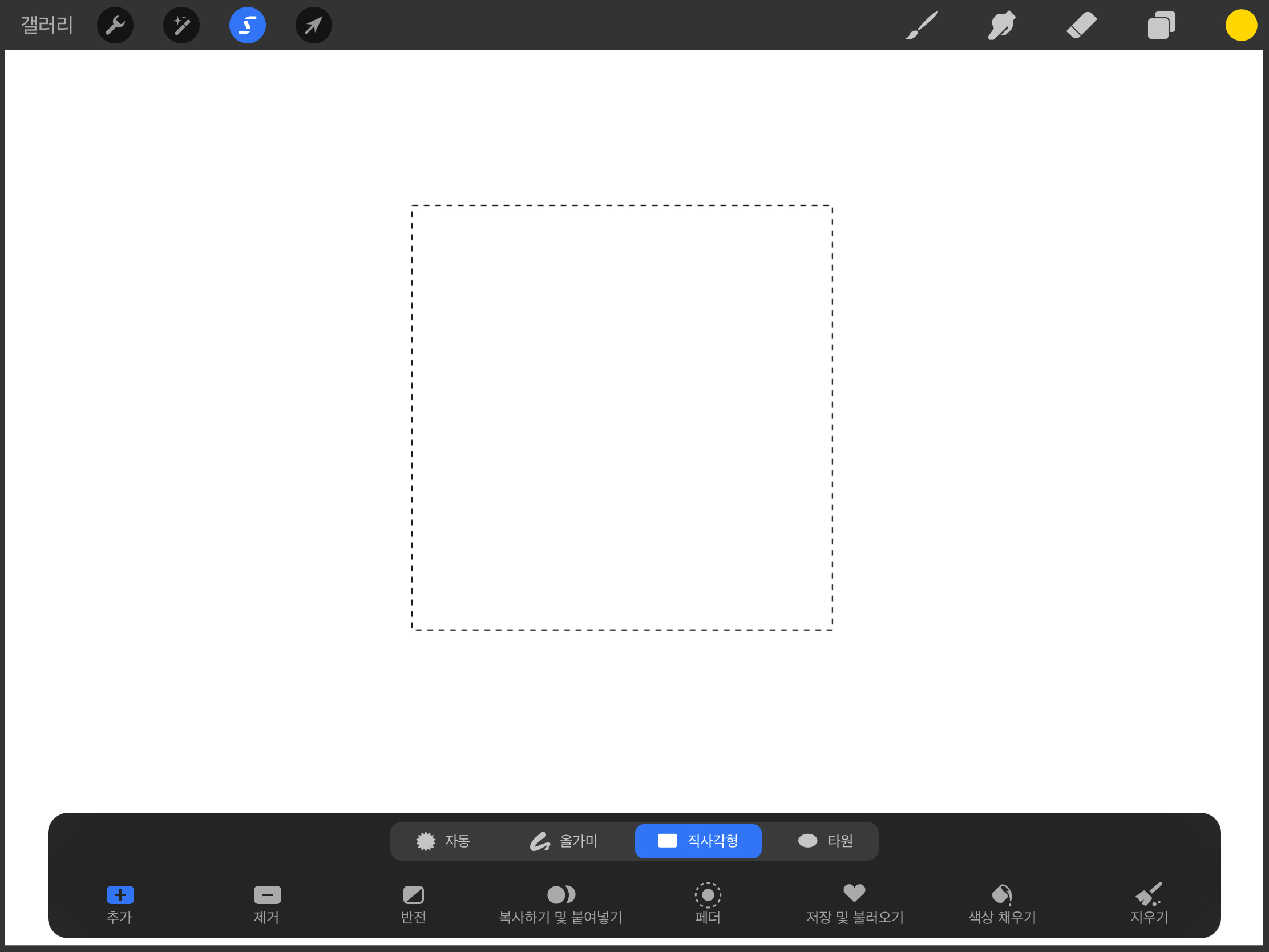 ▼ 그리고 상단에 있는 S자 모양의 선택(Selections)툴을 선택하고, 하단 [직사각형]을 선택한 뒤 포스트잇 모양의 사각형을 그려주세요.