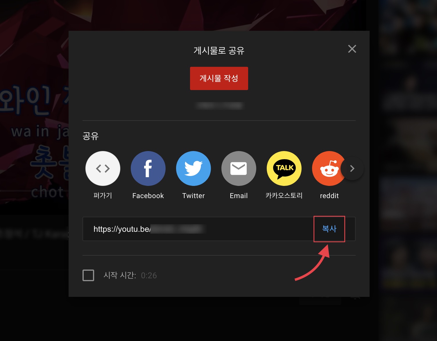 유튜브 영상에는 영상 아래 [공유] 버튼이 있습니다. 이 공유 버튼을 누르면 아래와 같이 링크를 복사할 수 있는 팝업창이 뜹니다.