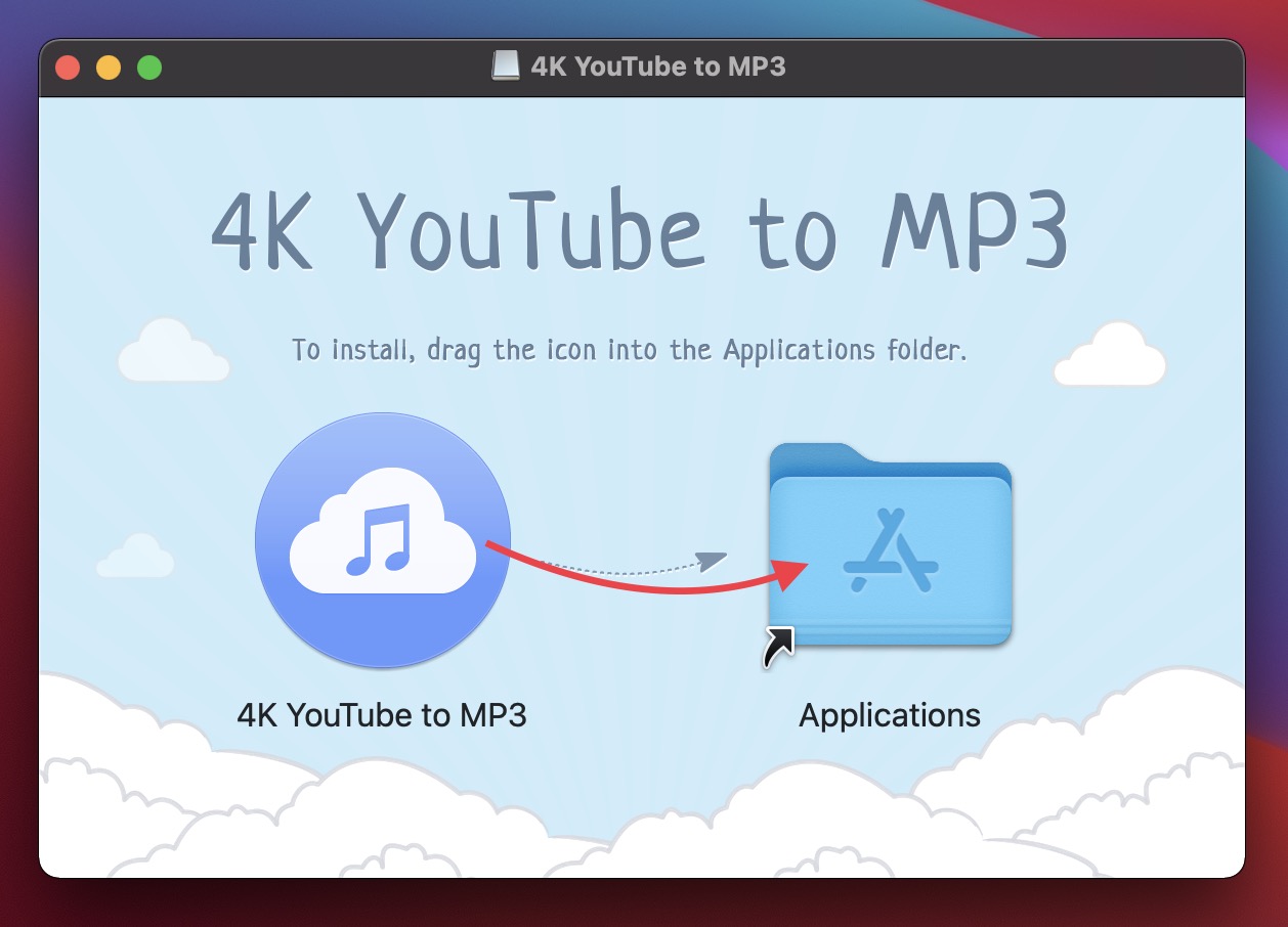 맥 컴퓨터에서는 왼쪽에 있는 아이콘을 오른쪽의 Applications 폴더에 옮겨 넣는 것만으로도 설치가 완료됩니다. 트랙패드를 이용해서 4K YouTube to MP3 아이콘을 어플리케이션 폴더 위로 움직여주세요.