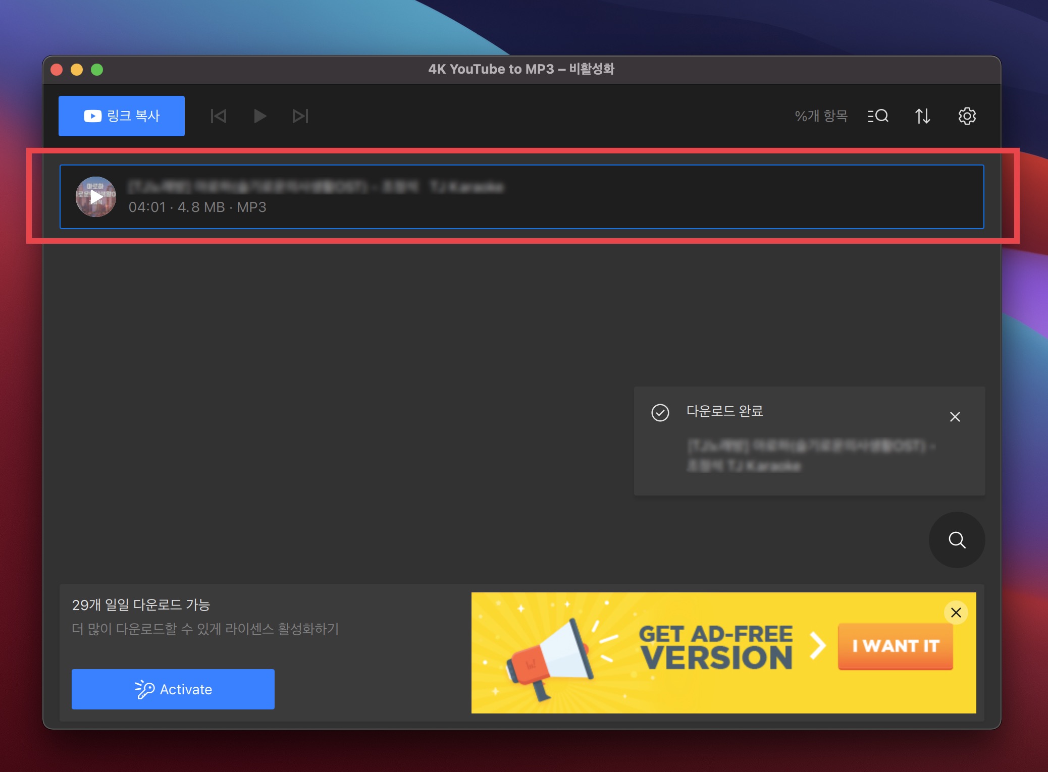 여기서 복사를 눌러주면 클립보드에 복사가 됩니다. 이제 다시 [4K YouTube to MP3]로 돌아가서 링크를 붙여 넣기 해주면 됩니다. 그러면 유튜브 음원 추출이 완료됩니다.