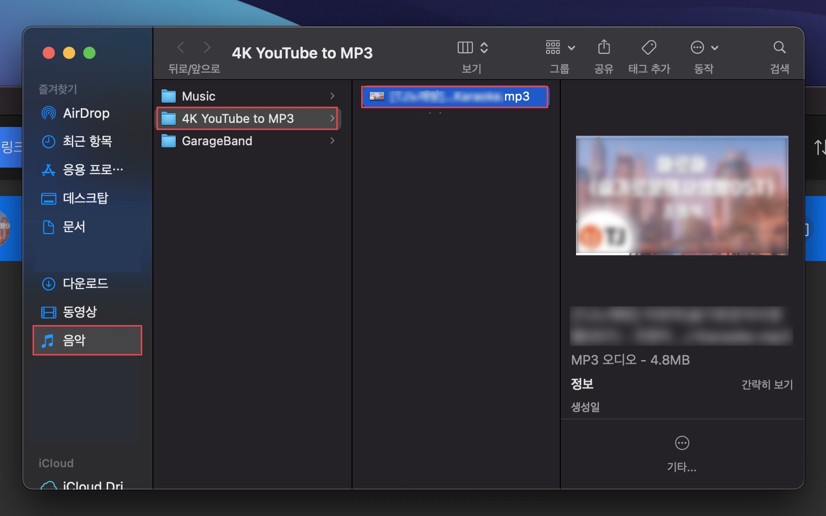 따로 붙여 넣기를 하지 않고 [+] 버튼을 누르는 것만으로도 자동으로 복사가 됩니다. 다운로드된 음원은 [Finder에서 보기]를 클릭하면 확인할 수 있습니다.