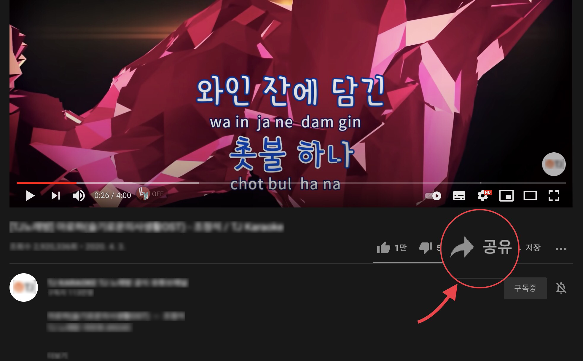 유튜브에 접속을 하겠습니다. 원하는 유튜브 영상에 가서 아래와 같이 공유 버튼을 눌러줍니다.