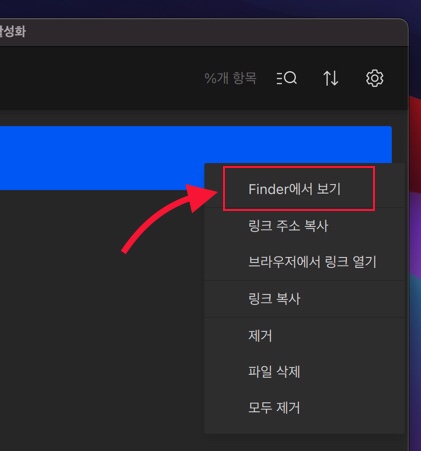 폴더 모양의 버튼을 누르면 바로 다운로드 폴더로 이동합니다. 점 세개 버튼을 눌러서 [Finder에서 보기]를 선택해도 됩니다.