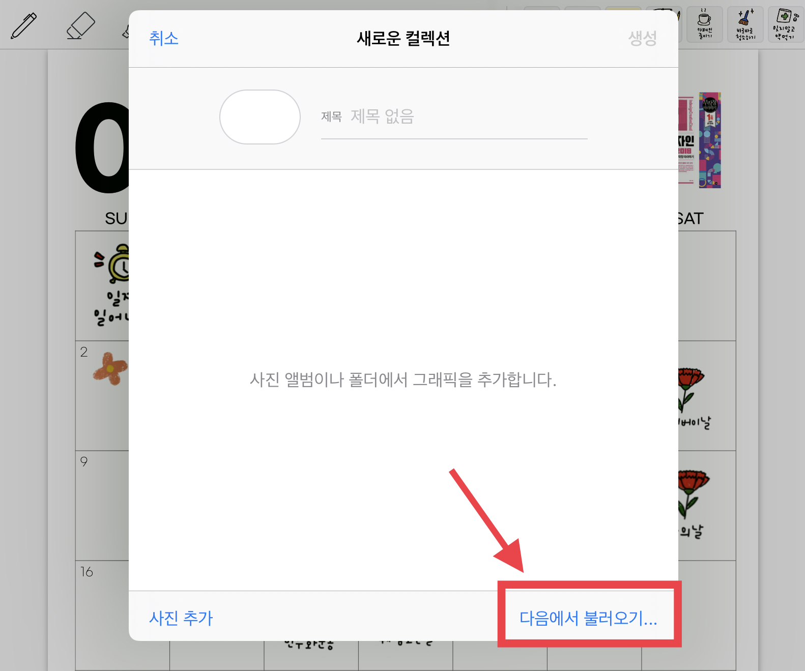 ▼ 아래와 같이 새로운 컬렉션이 나오면, 아래 [다음에서 불러오기]를 선택합니다.