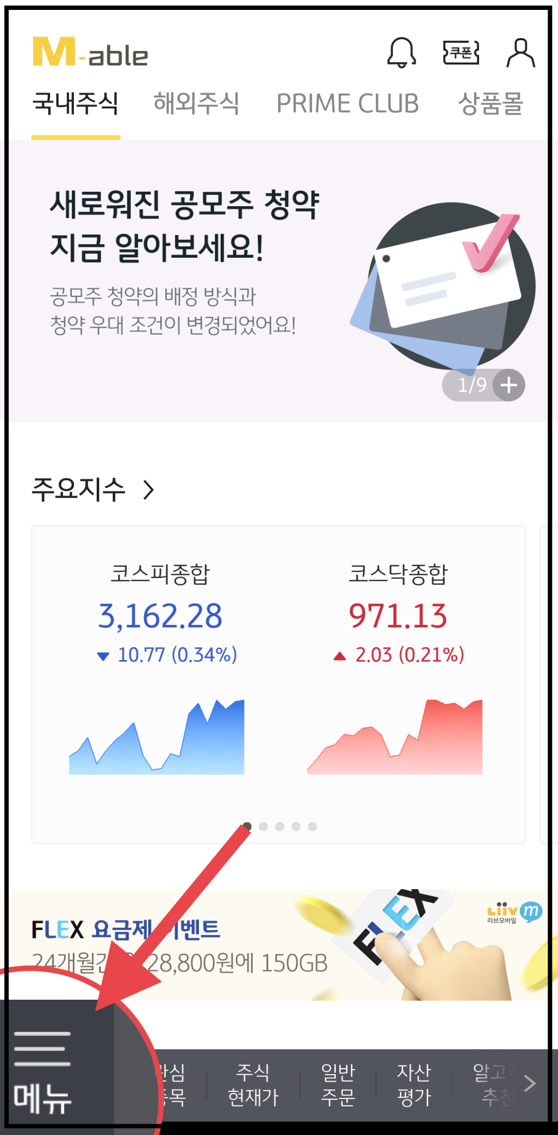 ▼ 홈에서 왼쪽 하단에 있는 메뉴 버튼을 누릅니다.