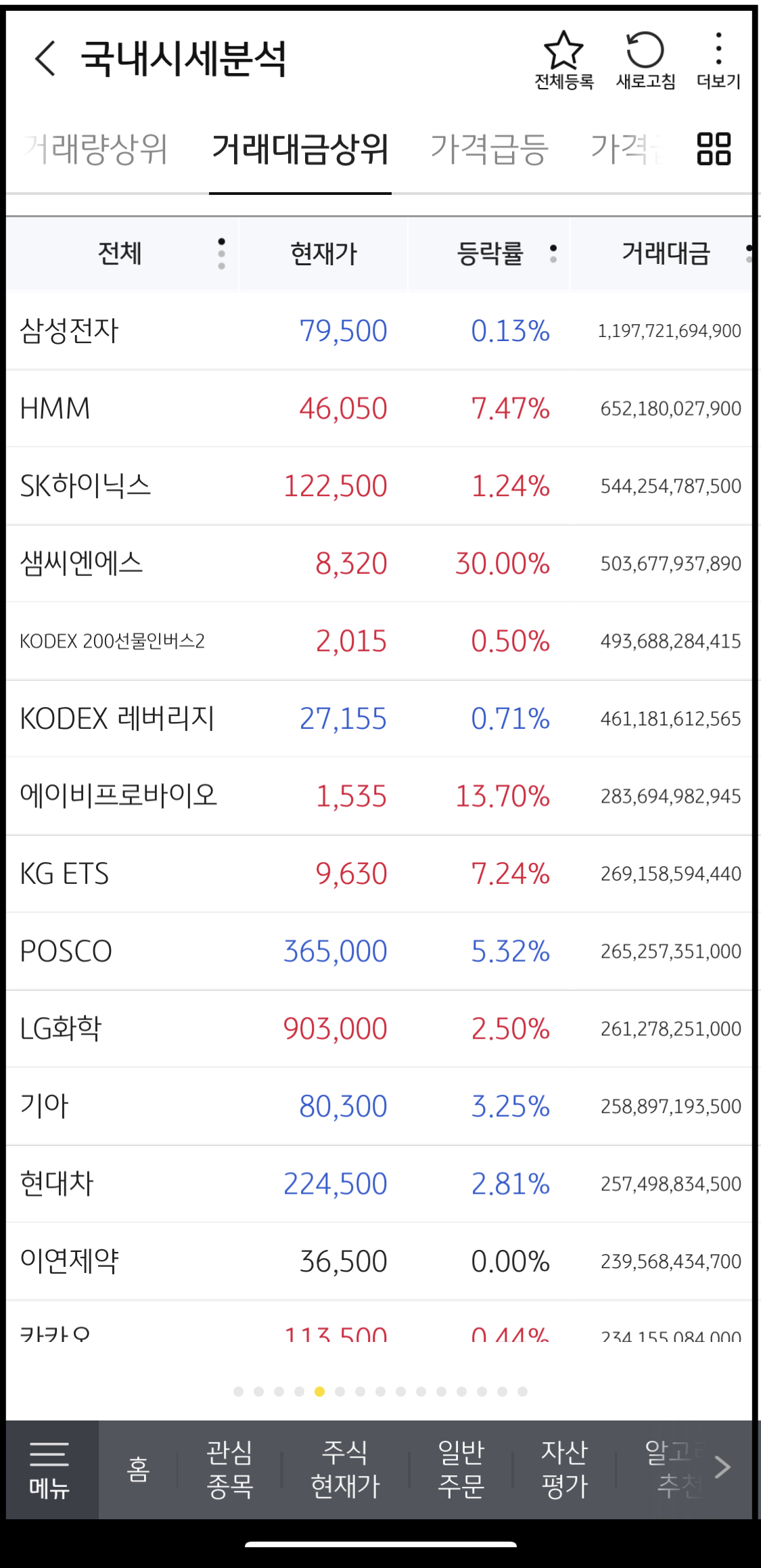 거래대금 뿐만 아니라, 가격 급등, 거래량 상위, 시간외 등락률 상위 종목등을 알 수 있습니다.